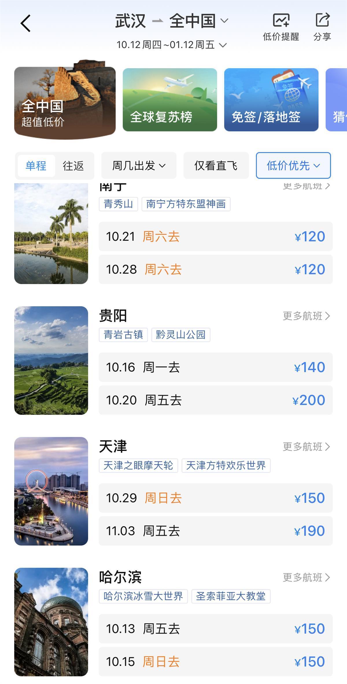 极目新闻记者在携程机票低价榜上看到不少一两百元的特价机票:例如,10月17日重庆到武汉机票最低1折只要150元;10月21日上海到武汉最低机票只要220元起,相当于1.2折;10月22日广州到武汉机票最低只要219元,最低折扣1.2折。