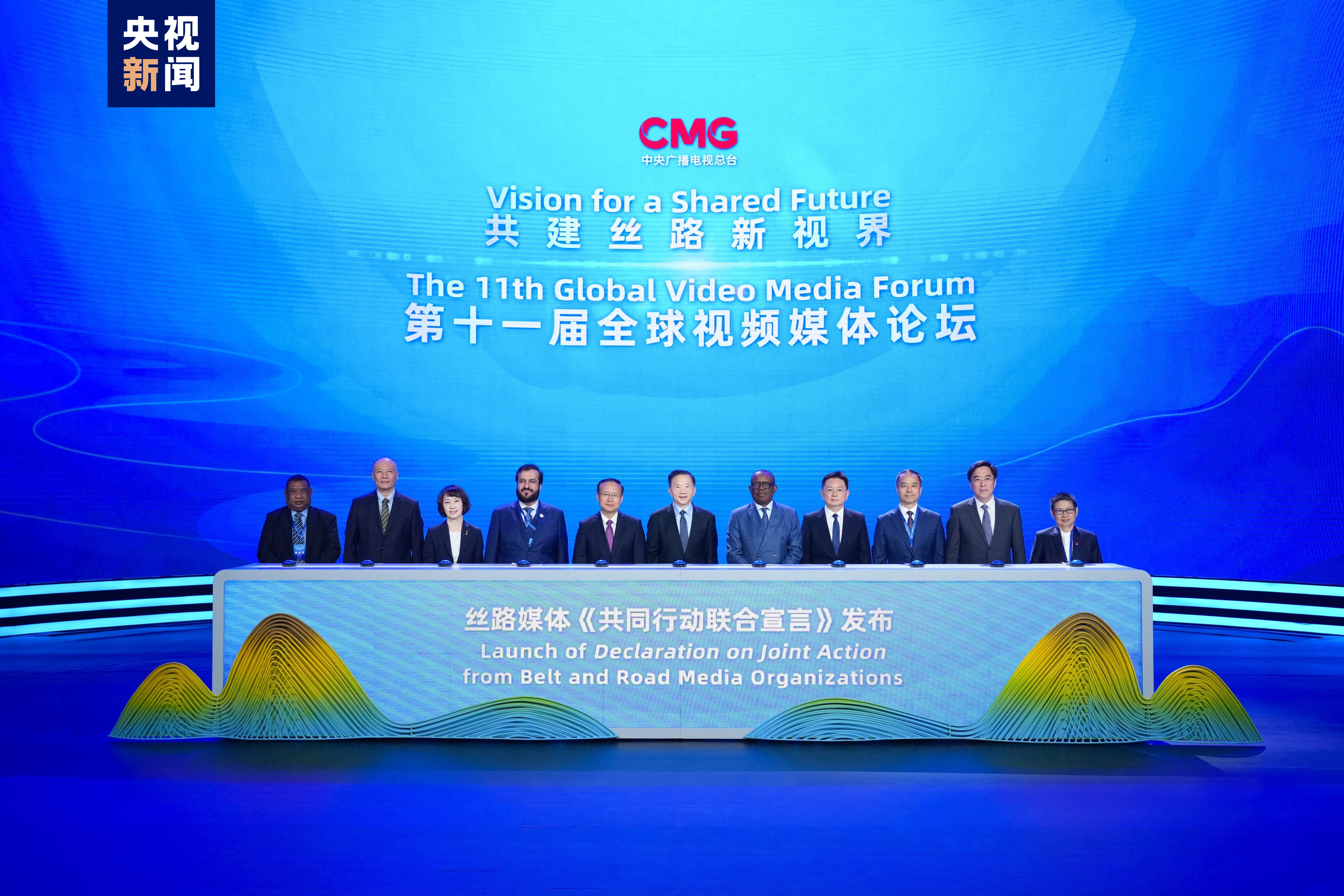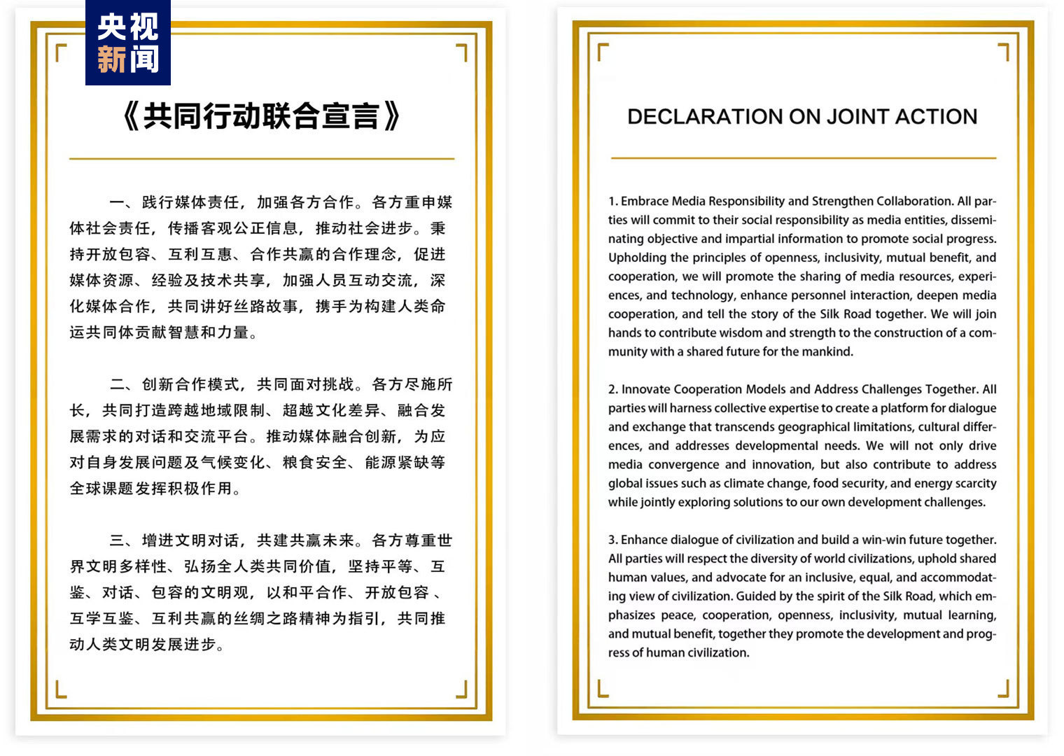 作为论坛一项重要成果,中宣部副部长、中央广播电视总台台长慎海雄,中宣部副部长、国务院新闻办公室主任孙业礼,商务部副部长凌激,人民日报社副总编辑崔士鑫,新华社副社长朱海黎,中央广播电视总台副台长邢博,总台编务会议成员范昀与国际媒体组织机构代表共同发布丝路媒体《共同行动联合宣言》。