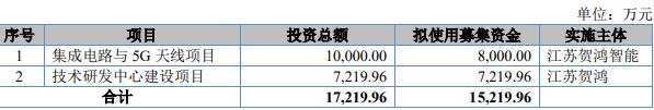 贺鸿电子原拟在北交所向不特定合格投资者公开发行股票不低于1,000,000股且不超过8,000,000股(未考虑超额配售选择权)。公司及主承销商可以根据具体发行情况择机采用超额配售选择权,采用超额配售选择权发行的股票数量不得超过本次发行股票数量的15%,即不超过1,200,000股,公司拟向不特定合格投资者发行股票数量不超过9,200,000股(含本数)。公司原拟募集资金15,219.96万元,计划用于集成电路与5G天线项目、技术研发中心建设项目。