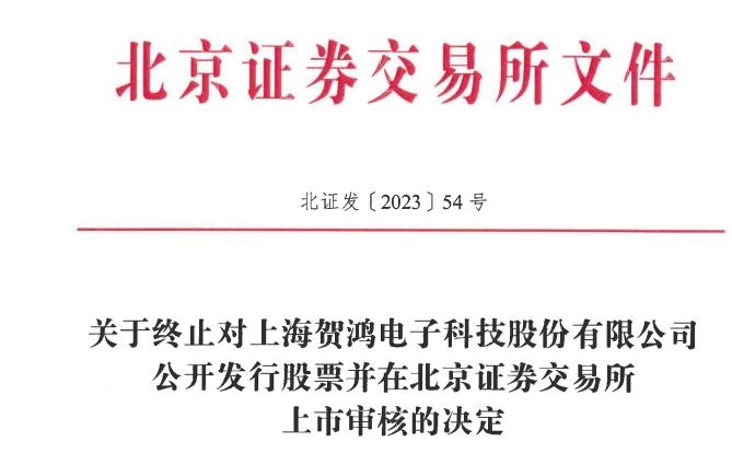 北交所于2022年12月30日受理了贺鸿电子提交的公开发行相关申请文件,并按照规定进行了审核。2023年9月25日,贺鸿电子向北交所提交了《贺鸿电子及海通证券关于撤回向不特定合格投资者公开发行股票并在北京证券交易所上市申请文件的申请报告》。根据《北京证券交易所向不特定合格投资者公开发行股票并上市审核规则》第五十三条的有关规定,北交所决定终止贺鸿电子公开发行股票并在北交所上市的审核。