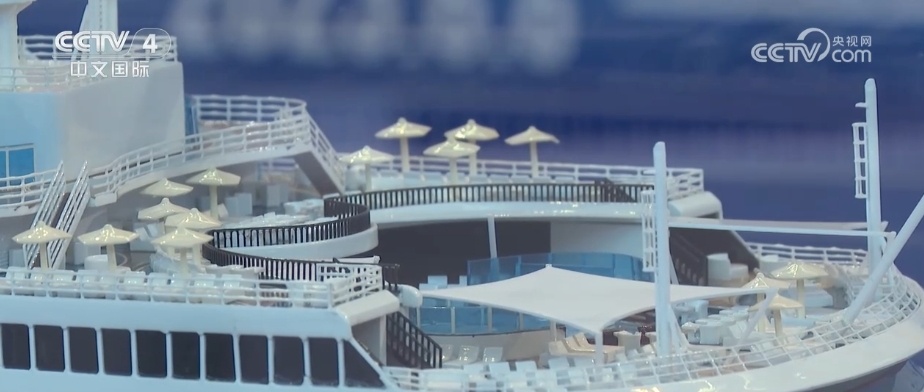这个模型就是国产首艘大型邮轮“爱达·魔都”号,邮轮零部件数量多达2500万个,是复兴号高铁的13倍,敷设电缆超过4200公里。2023年9月,“爱达·魔都”号试航圆满成功,实现了中国大型邮轮设计建造零的突破。