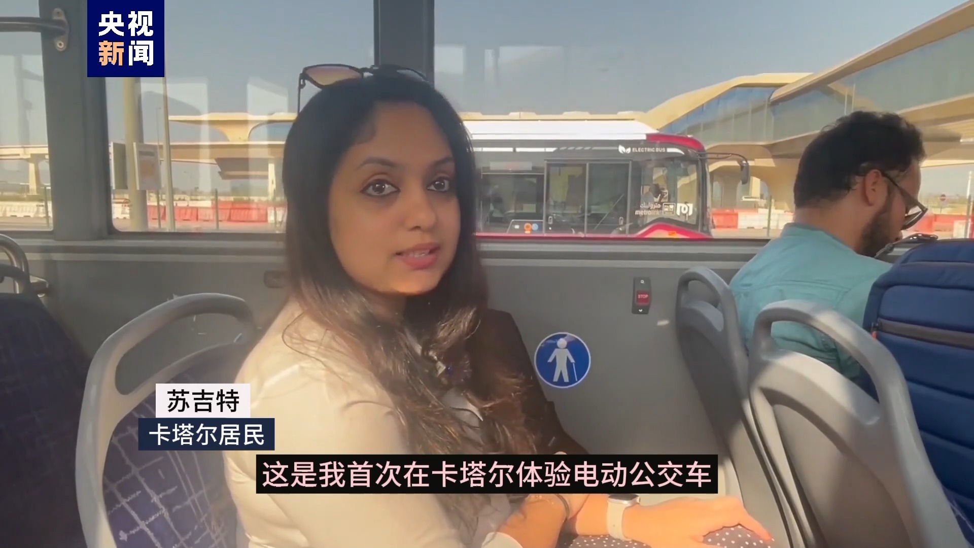 卡塔尔居民 苏吉特:这是我首次在卡塔尔体验电动公交车。相比其他公交车,电动公交车更注重安全性。车的外观也不一样,让乘客更加便利。你看这个大大的车窗,有着更好的视野。此外,电动客车污染少,更加环保。