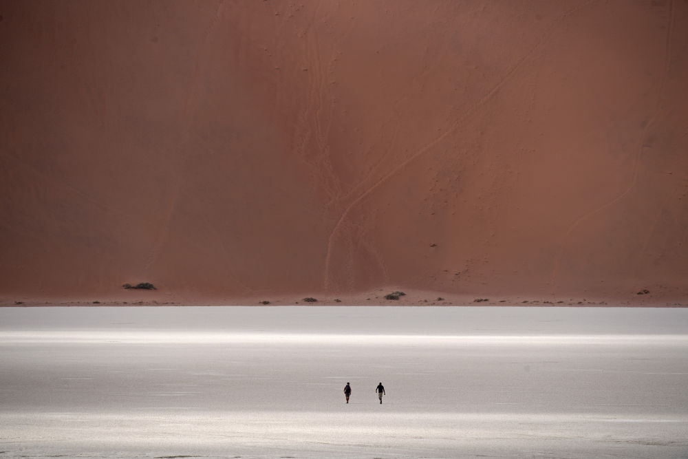 2022年1月16日,在纳米比亚的纳米布-诺克卢福国家公园,游客走在盐沼地中。新华社记者陈诚摄