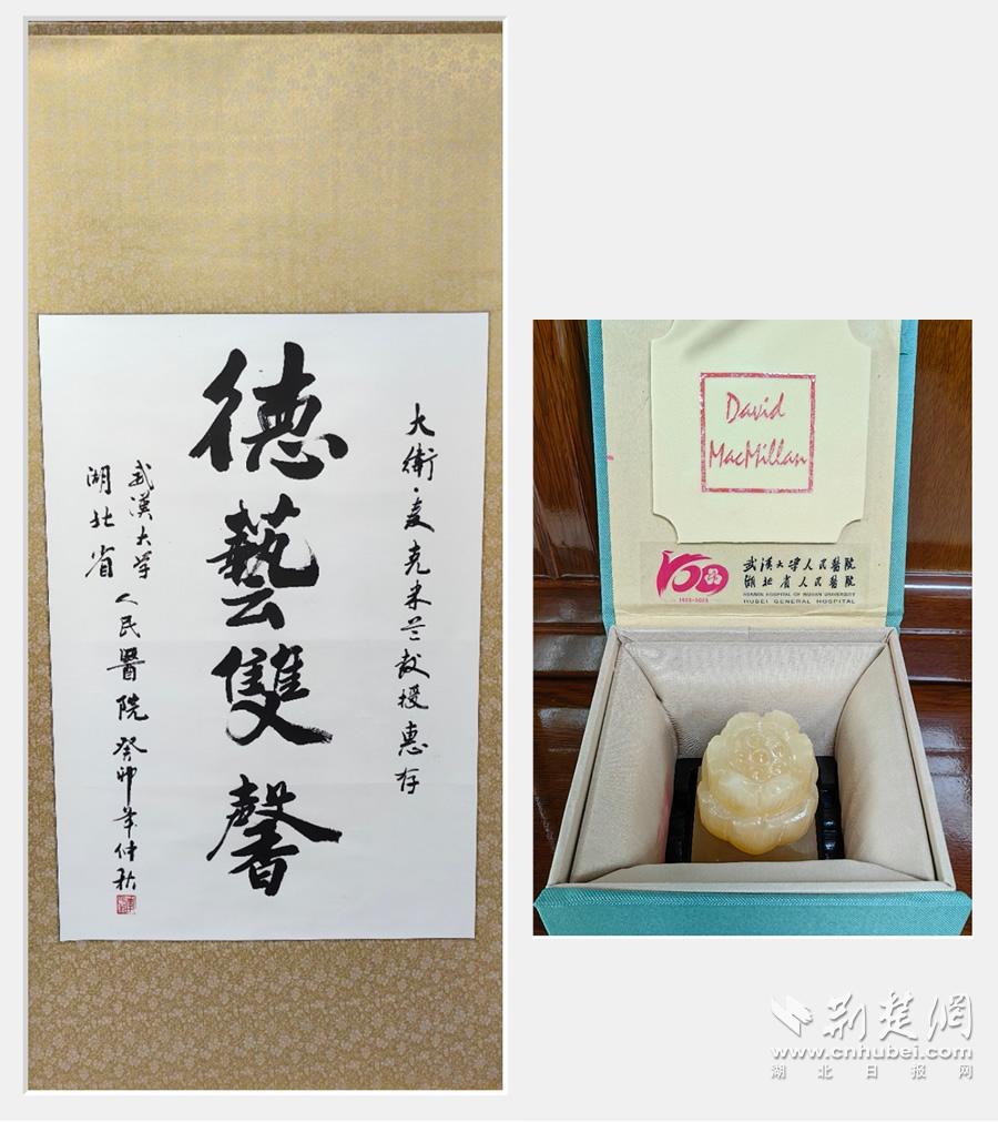 万红慧书记向大卫·麦克米兰教授赠送纪念品——“德艺双馨”的书法作品和融入医院百年院庆元素的玉石印章,称赞其为具有高尚品德和杰出学术成就的学者,为世界科技进步做出了重要贡献。