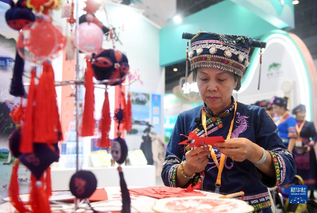 10月13日,在广西桂林新国际会展中心,一名非遗传承人在旅游展上展示剪纸技艺。