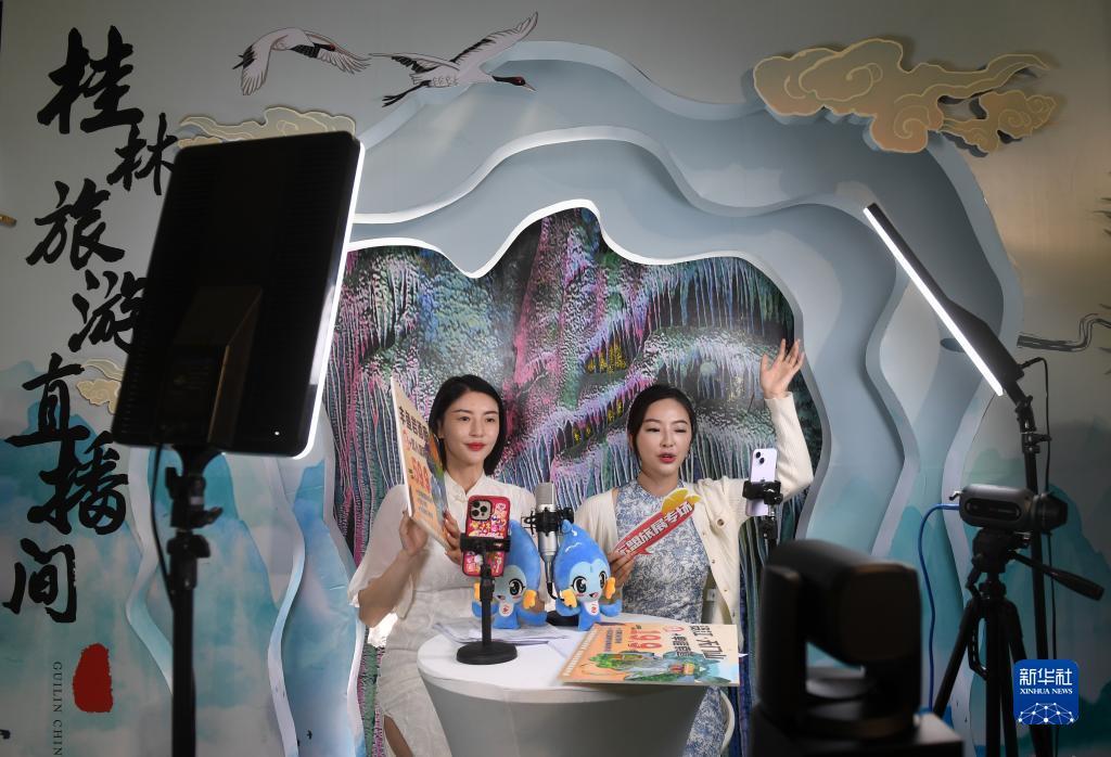10月13日,在广西桂林新国际会展中心,两名女子在旅游展上通过网络直播推介旅游产品。