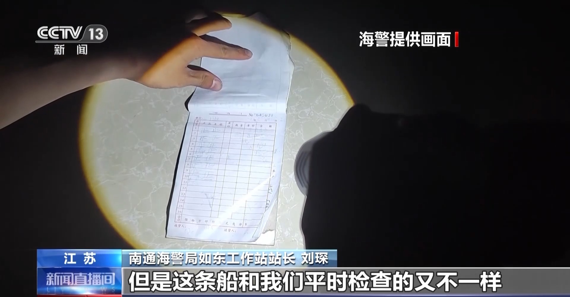 南通海警局如东工作站站长 刘琛:我们控制住现场后,船上人员说他们舱内装的都是些渔获物,但是这条船却又跟我们平常检查的不一样,因为这条船上一点鱼腥味都没有,这又加深了我们的怀疑。