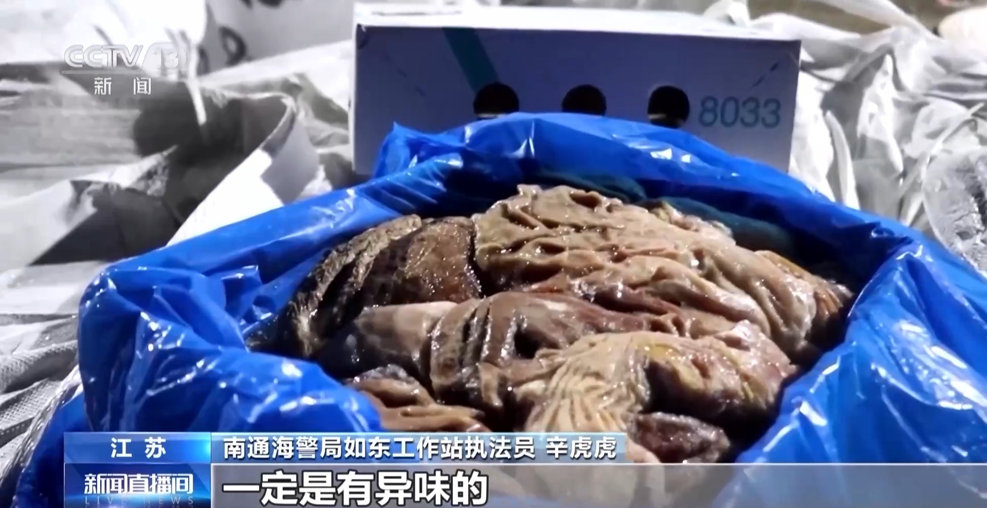 南通海警局如东工作站执法员 季元:市面上突然出现这么多的冻品,根据我们日常的海上执法经验,近期很有可能有犯罪团伙从事走私活动。