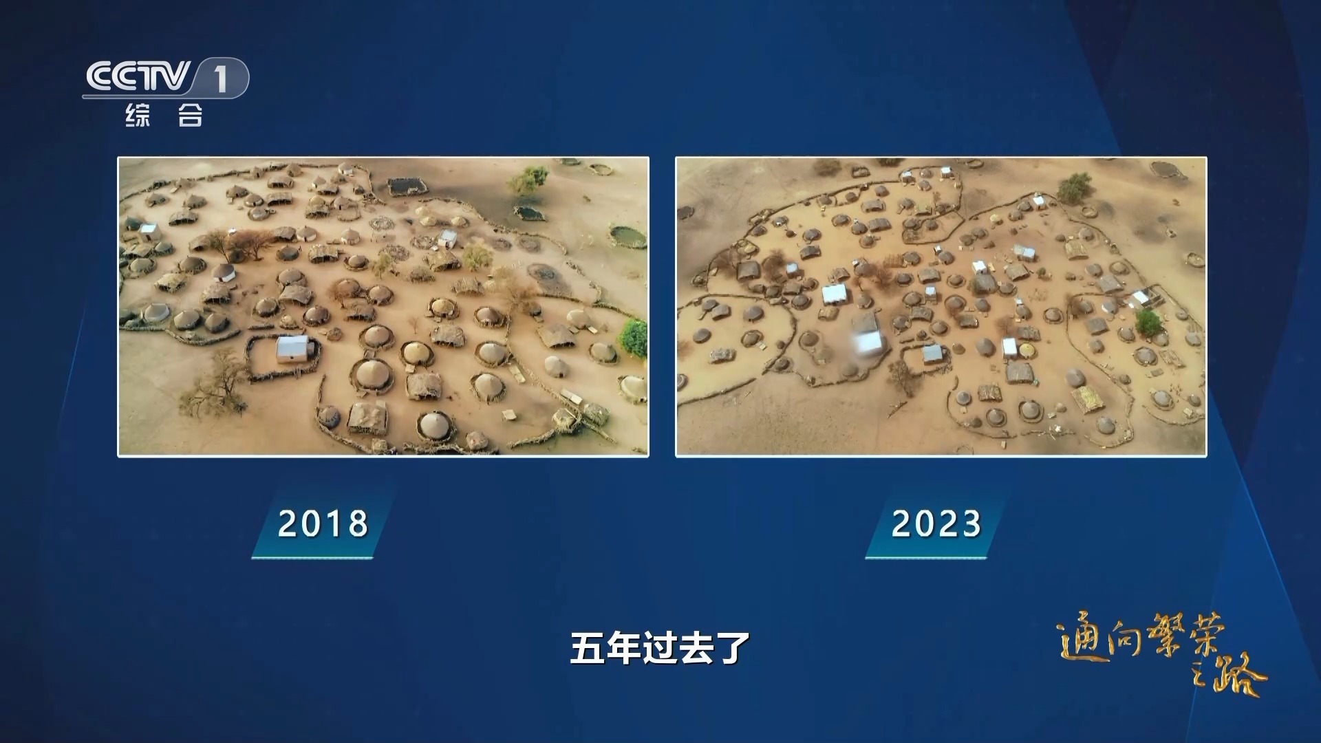 2018年,无人机的镜头曾经从空中俯瞰这个荒漠上的小小村落。五年过去了,镜头再次对准这里,小村庄里多了些闪亮的东西,那是新房屋顶上的铁皮在烈日下反射的光芒。