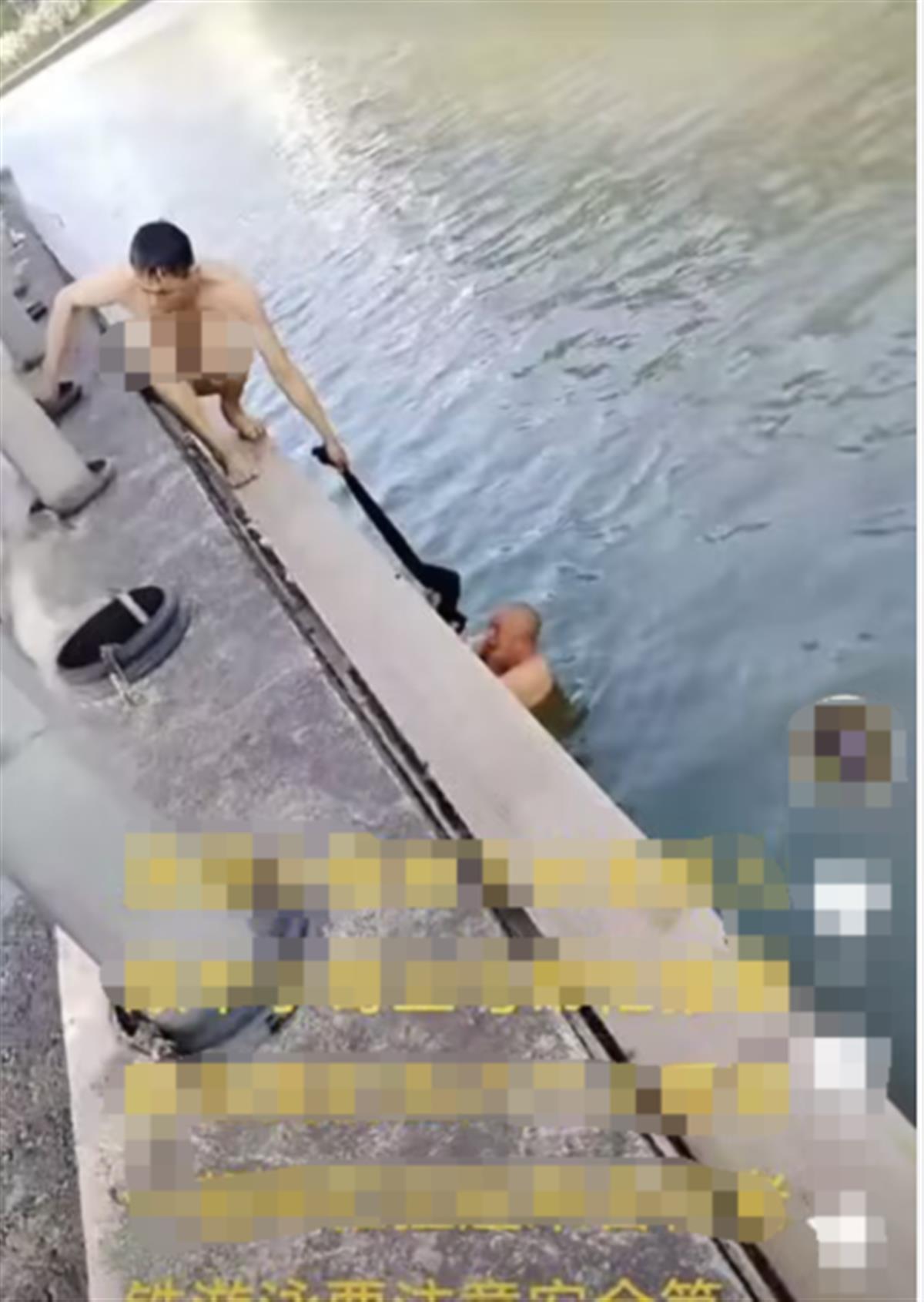 网络视频显示,在位于河边的一条城市道路上,一名外卖小哥双手抱着一根路灯杆,将一条腿向下伸到靠近水面,一名在水中的男子试图抓住外卖小哥的腿爬上岸;落水男子抓住岸上一名男子抛出的衣服,岸上多名群众正在尝试营救他。