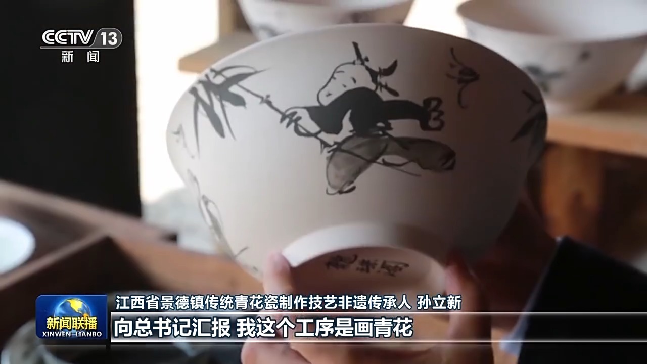 江西省景德镇传统青花瓷制作技艺非遗传承人 孙立新:向总书记汇报,我这个工序是画青花,我用了二十秒时间,把这个婴戏图画好,手持竹子寓意着我们的生活节节高,总书记叮嘱我们,陶瓷是中华的瑰宝,是中华文明的重要名片,我们一定会把这份传统技艺发扬好、传承好,让世界了解新时代的景德镇。