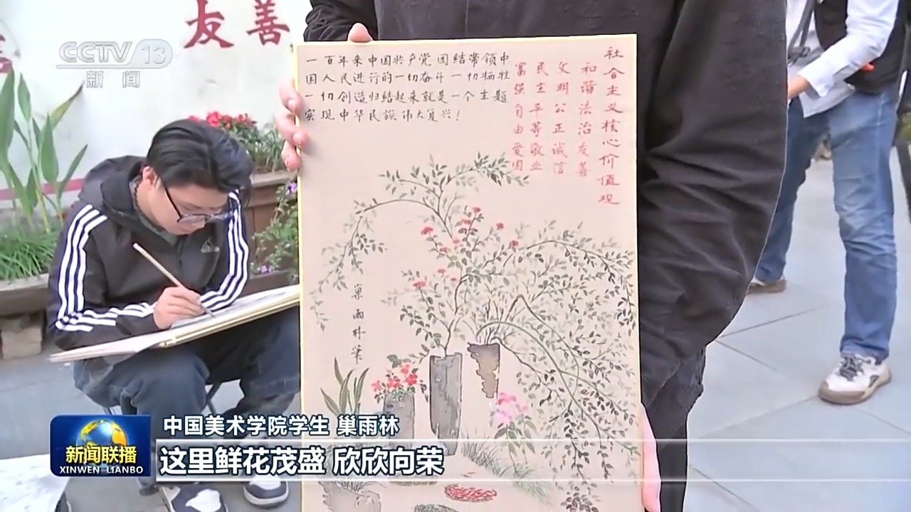 中国美术学院学生 巢雨林:我画的是这样一个墙角,这里鲜花茂盛,欣欣向荣,并且前面加了一个“晒秋”丰收的景象。总书记他教导我就是学艺术一定要打好基本功,我们以后的日子里要拿着画笔更好地描绘中国故事。