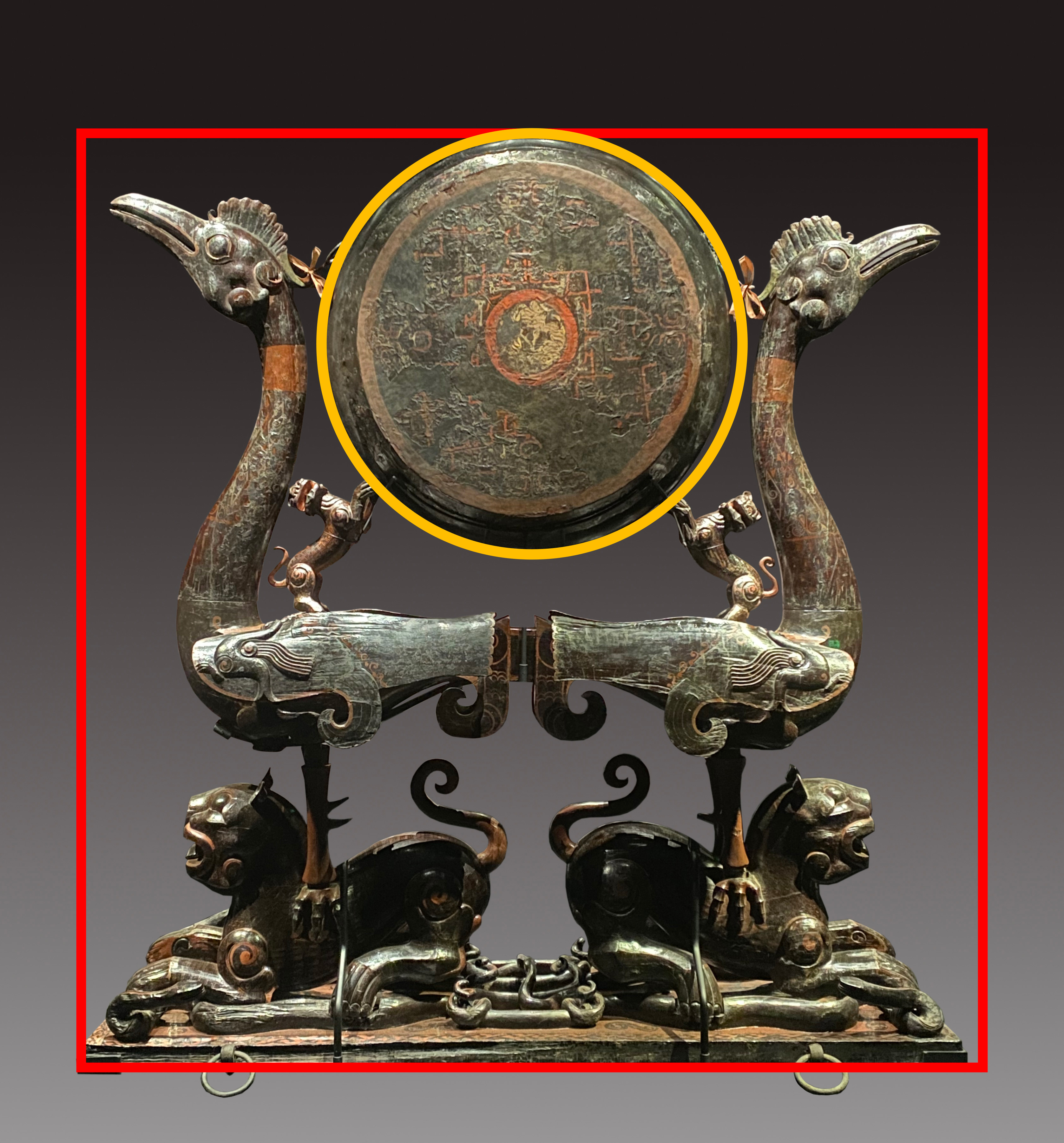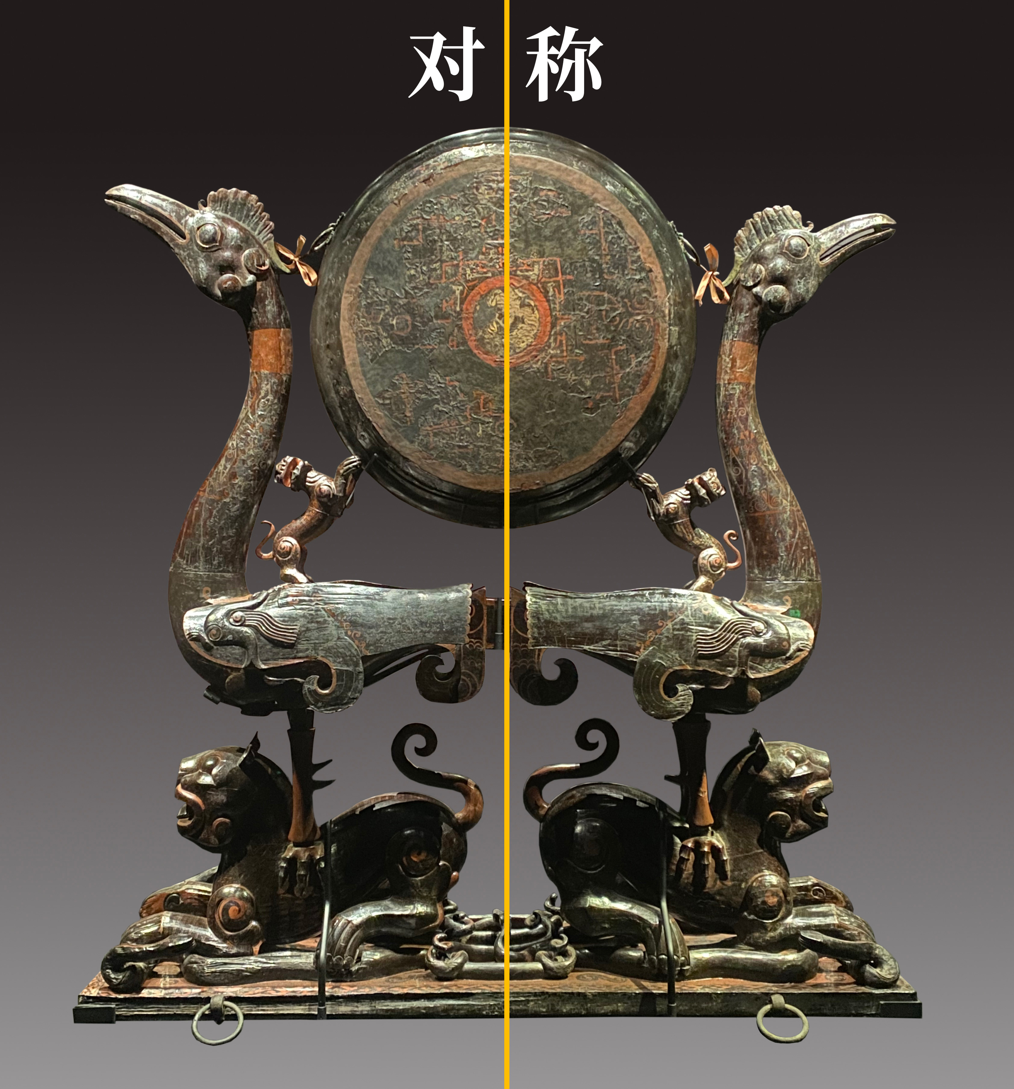△漆木彩绘虎座凤鸟悬鼓(荆州博物馆藏)