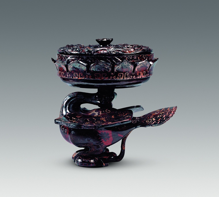 △漆木彩绘凤鸟莲花盖豆(荆州博物馆藏)