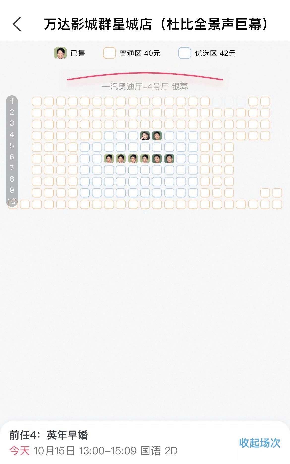 在武汉多个万达影城,同场次的电影座位则被分为普通区、优选区两种,优选区价格略高一些。例如万达影城武昌群星城店,10月15日13时放映的《前任4:英年早婚》,全场共10排、186个座位,优选区为4排至9排中间区域,共58个座位,价格为42元,普通区价格为40元。