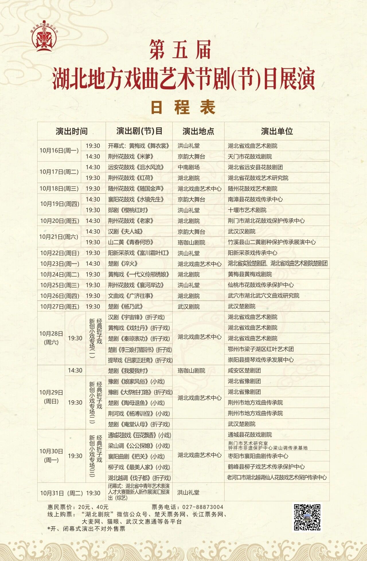 据了解,第五届湖北地方戏曲艺术节推出了一大批优惠票及免费票。各场演出(开闭幕式除外)均实行20元、40元的惠民票价,同时组委会将于每场演出开演前两日起向观众提供一定数量的免费惠民票,65岁以上人士可凭老年证或有效身份证前往各剧院窗口领取所在剧院上演的演出场次门票1张(开闭幕式除外),每人每个证件限领1张,领完为止。
