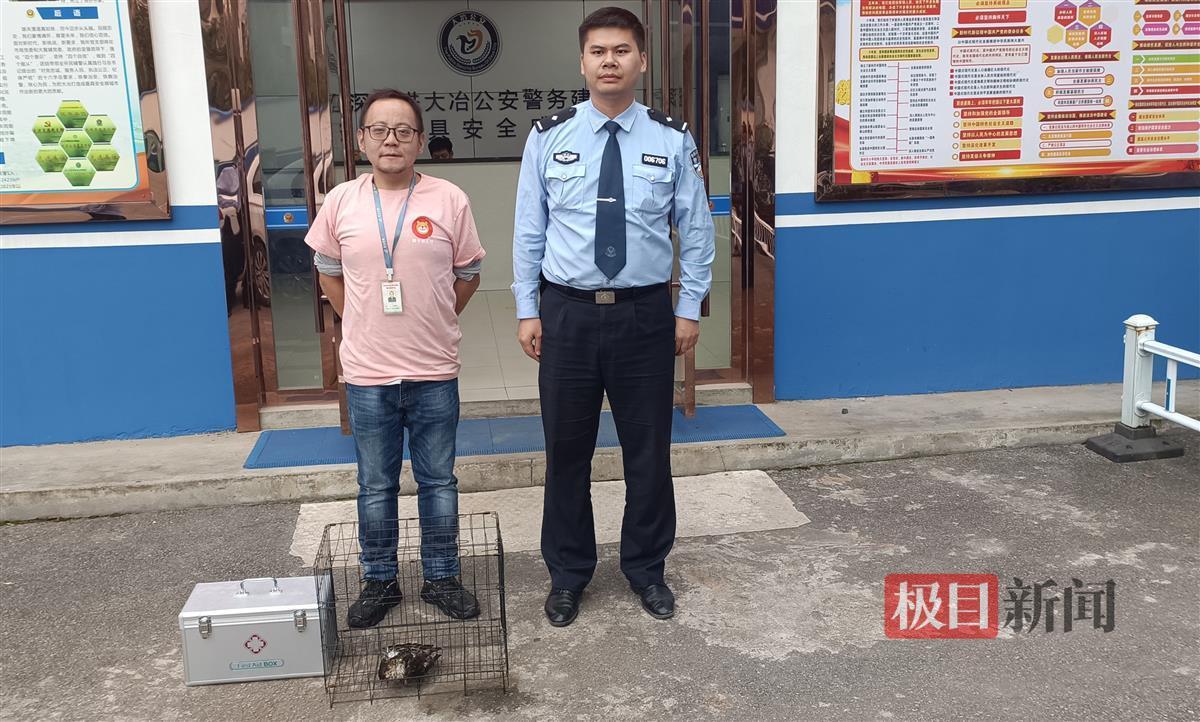 民警明文强赶到现场后,小心地将飞禽装入笼内,将其带回派出所,并打电话向大冶市动物保护协会寻求帮助。