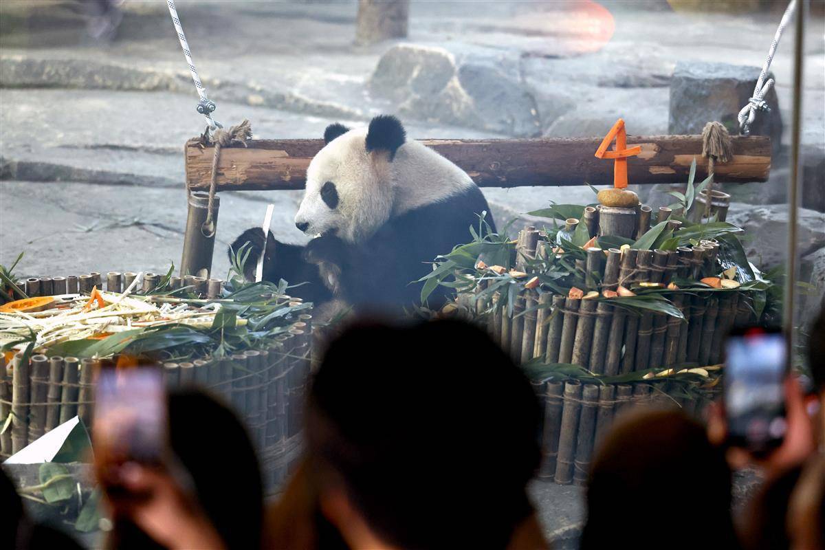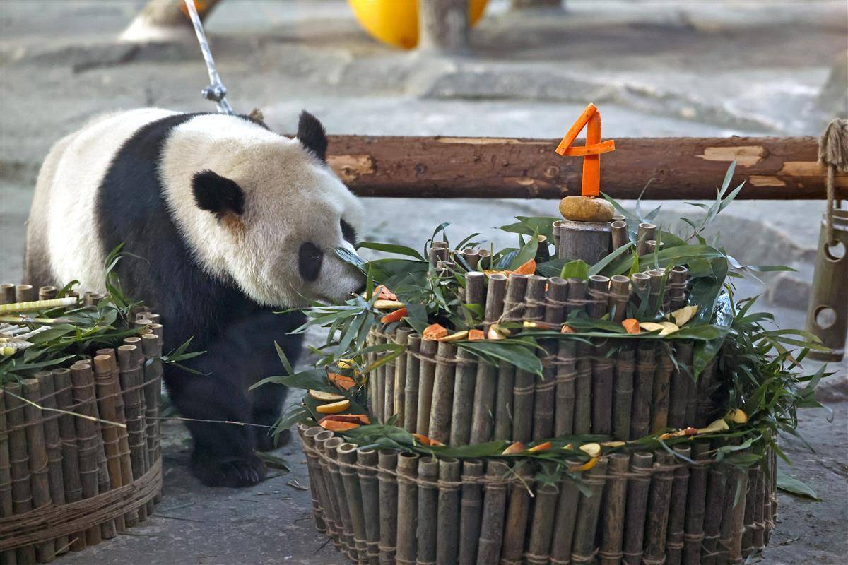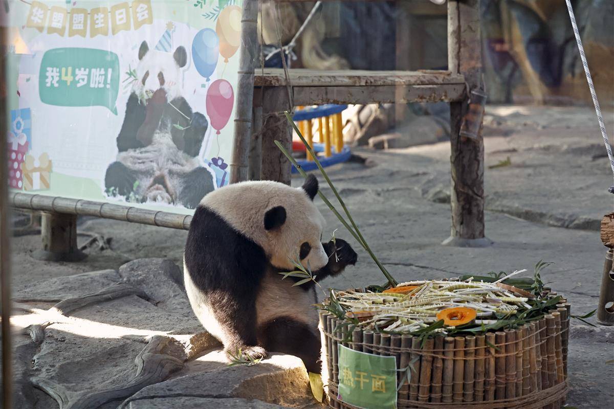 2023年10月17日,在武汉动物园熊猫馆内,在“我四岁啦!”的主题背景前,大熊猫“盟盟”品尝着自己的生日大餐,以热干面为造型的竹笋“长寿面”,和以竹子、竹笋以及苹果、胡萝卜制成的三层生日蛋糕。当日,大熊猫“盟盟”在武汉动物园迎来4岁生日,园方开展了一场温馨有趣的生日会,除了为大熊猫制作美食,还在现场开展科普讲座,同时,来自社会及高校的20名志愿者还在现场共同绘制科普提示牌,让公众进一步了解大熊猫的生活习性,传播科普知识、倡导游客文明游园。(湖北日报全媒记者 倪娜 通讯员 邓丽玲 乐霞 摄)