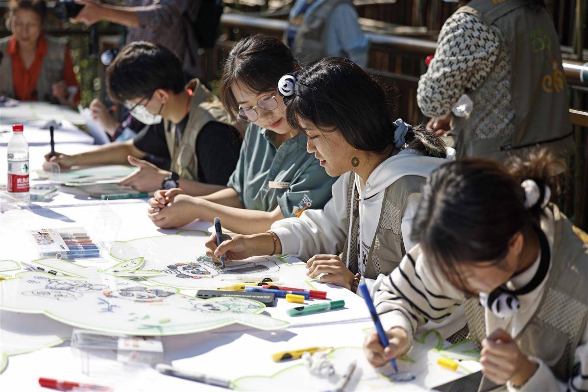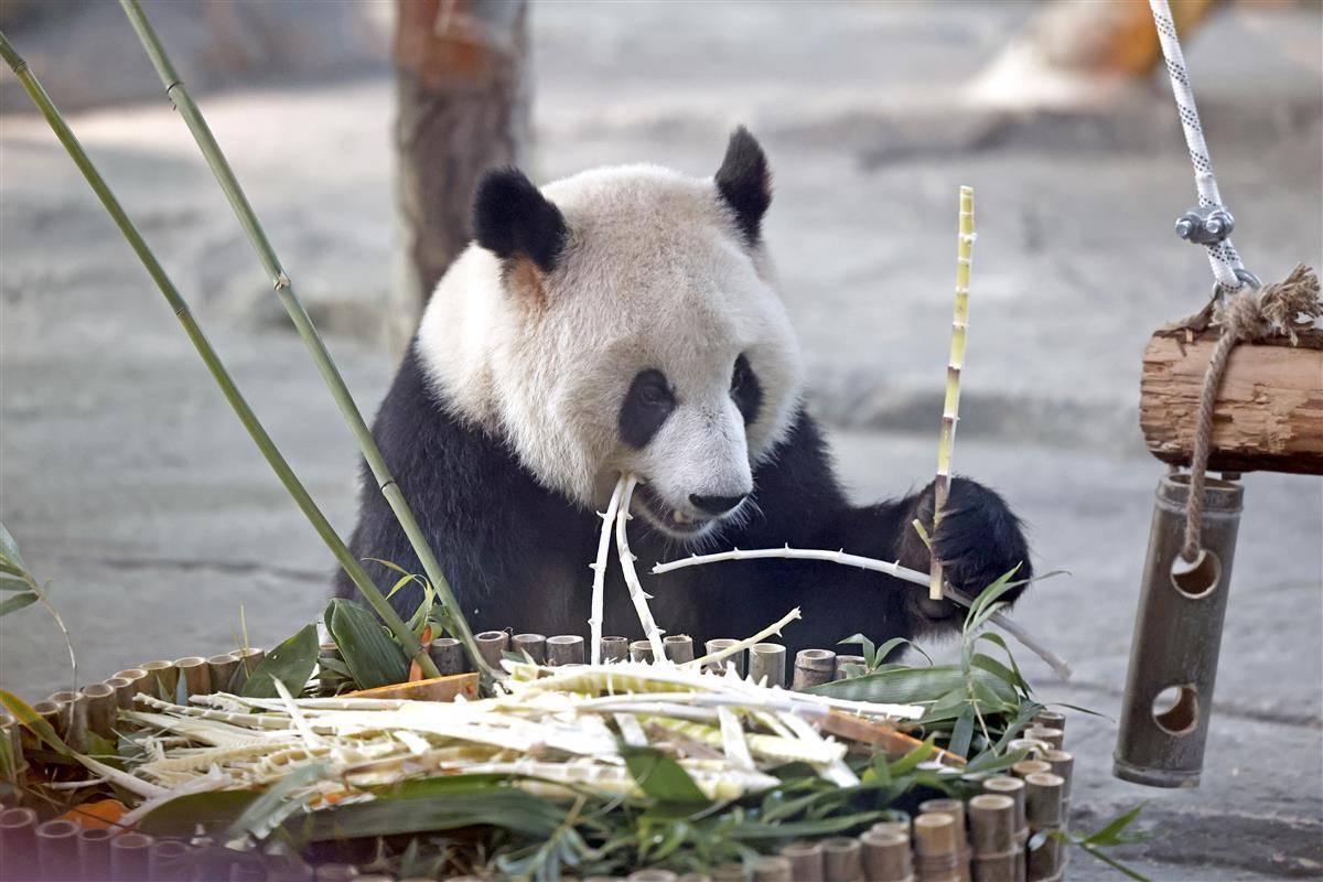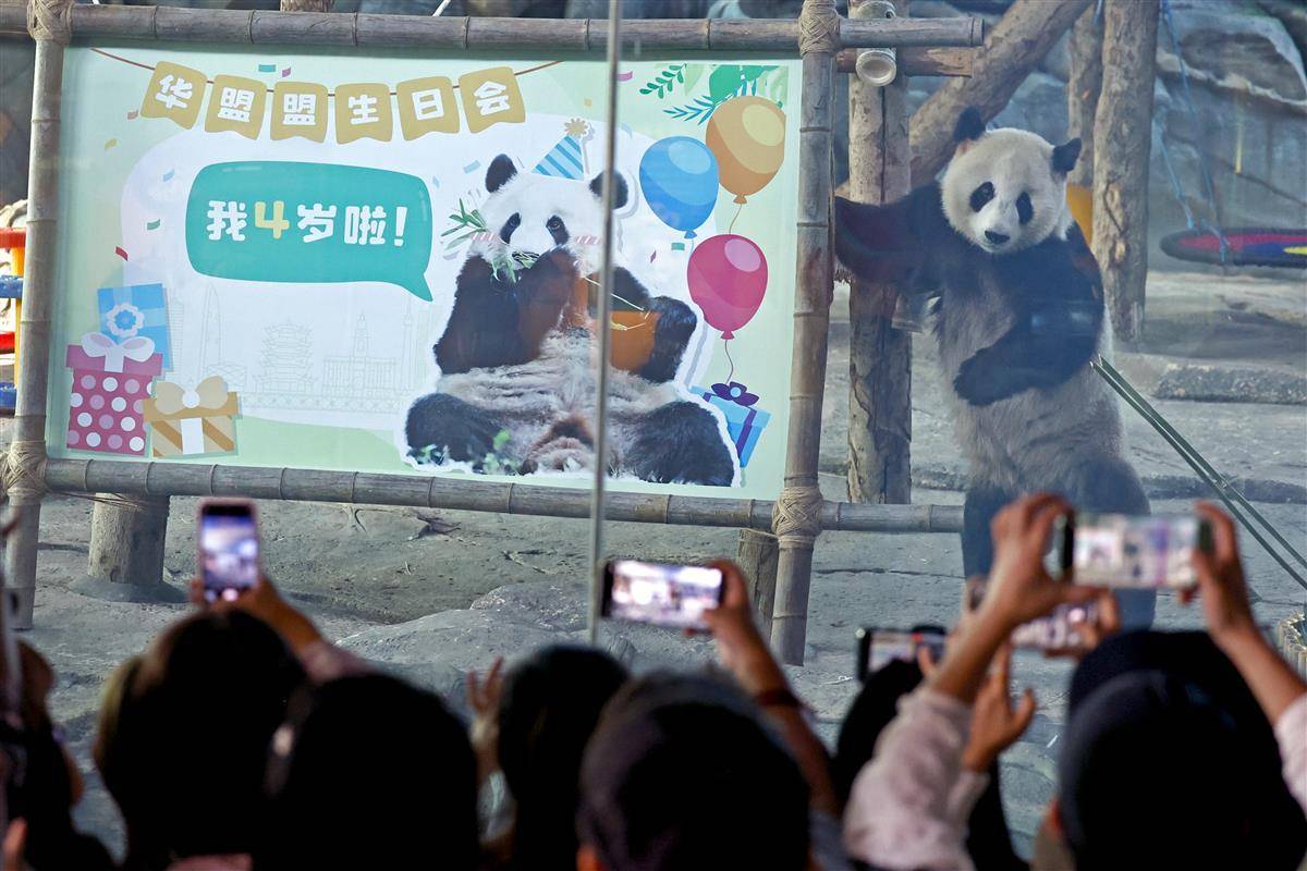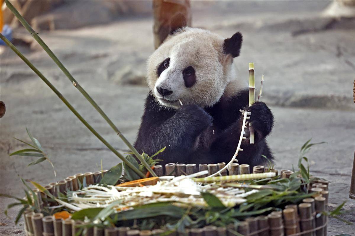 2023年10月17日,在武汉动物园熊猫馆内,在“我四岁啦!”的主题背景前,大熊猫“盟盟”品尝着自己的生日大餐,以热干面为造型的竹笋“长寿面”,和以竹子、竹笋以及苹果、胡萝卜制成的三层生日蛋糕。当日,大熊猫“盟盟”在武汉动物园迎来4岁生日,园方开展了一场温馨有趣的生日会,除了为大熊猫制作美食,还在现场开展科普讲座,同时,来自社会及高校的20名志愿者还在现场共同绘制科普提示牌,让公众进一步了解大熊猫的生活习性,传播科普知识、倡导游客文明游园。(湖北日报全媒记者 倪娜 通讯员 邓丽玲 乐霞 摄)
