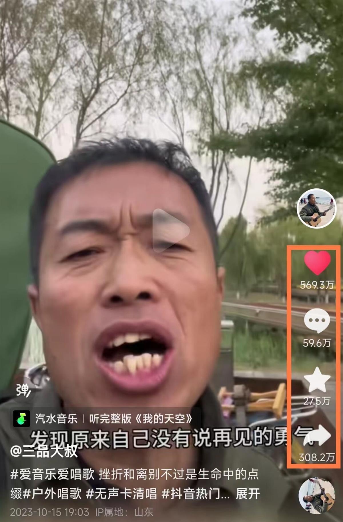 山东青岛博主“三品大叔”火了,他翻唱的《我的天空》在不到两天的时间里,点赞量近570万,评论量达59.6万条,被转发分享308万次。10月17日,三品大叔的朋友向极目新闻(报料邮箱:jimu1701@163.com)记者介绍,“三品大叔”年近50岁,本职是骑摩托车送货,唱歌和吉他都是自学成才。