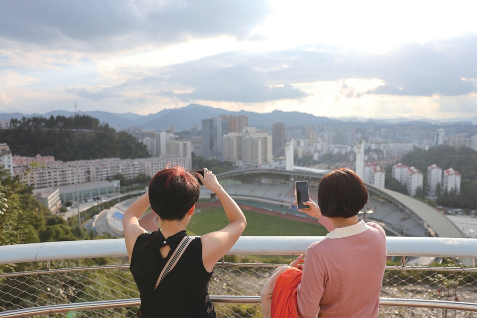 市民既可穿梭林间,亦能在山体上俯瞰全城。尝鲜市民在奥体中心后山上观景拍照。