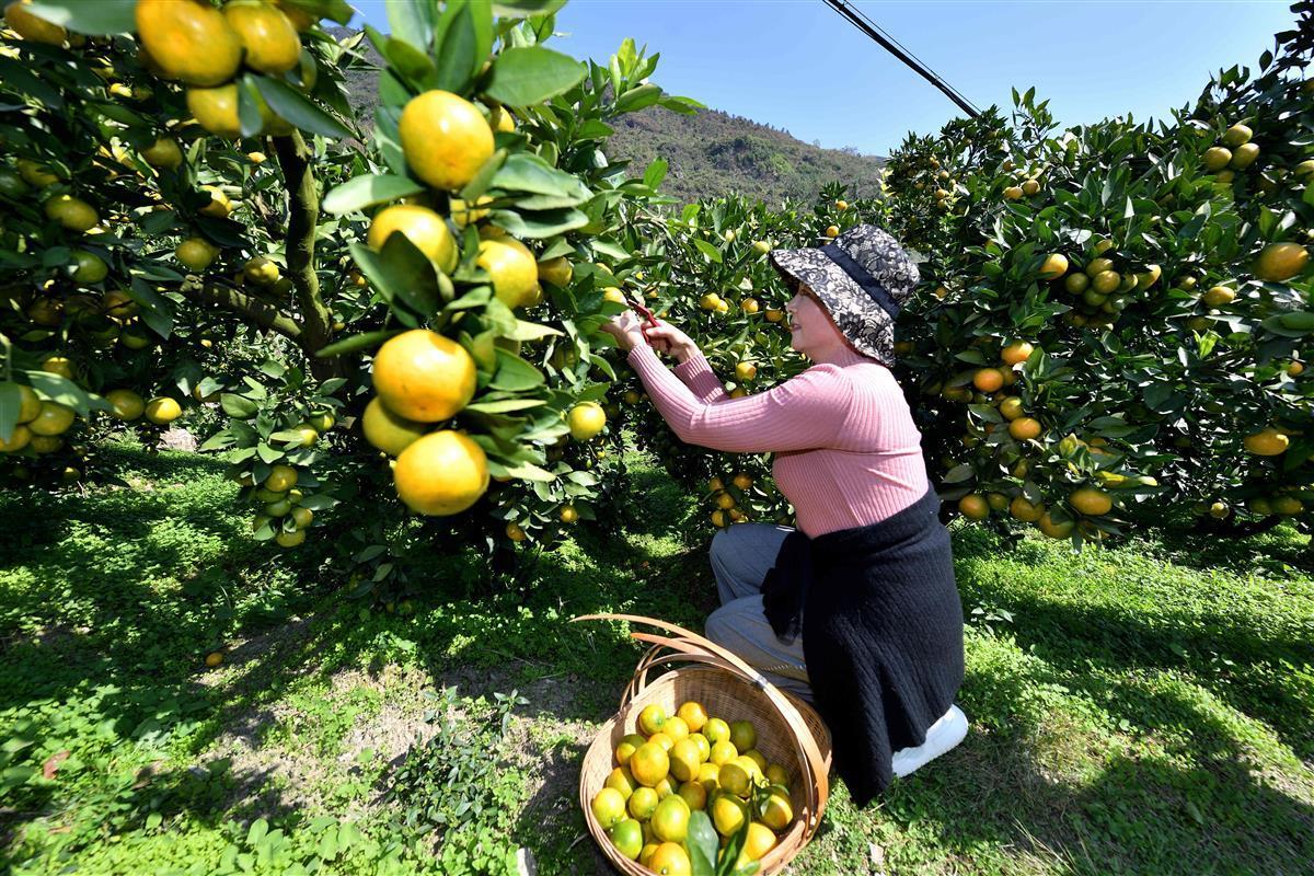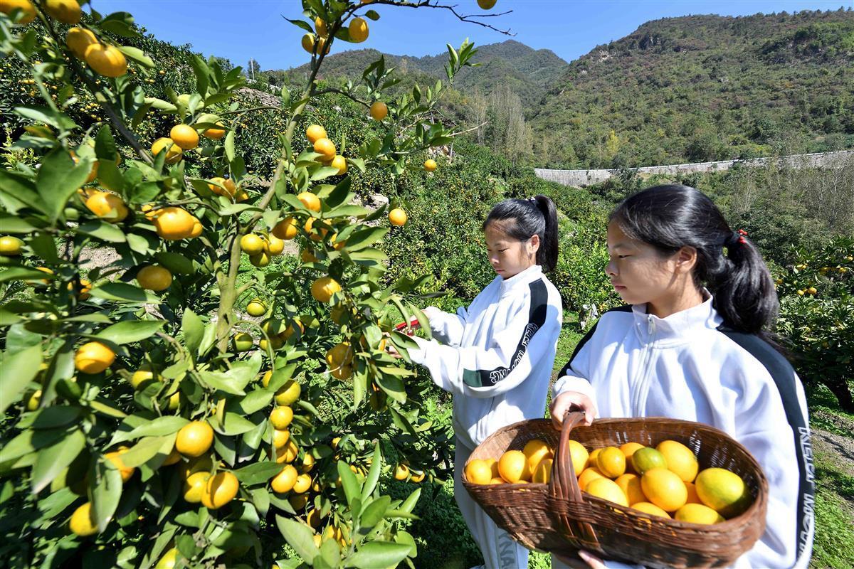 金秋时节,湖北省襄阳市保康县寺坪镇简家坪村的柑橘进入采摘期,吸引不少游客来到果园游玩采摘,享受丰收的喜悦。
