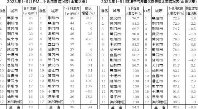 2023年1-9月,全省17个重点城市PM_2.5累计浓度均值为35μg/m^3,较去年同期上升9.4%。17个重点城市平均空气质量优良天数比率为82.2%,较去年同期减少0.9个百分点。17个重点城市PM_10累计浓度均值为59μg/m^3,较去年同期上升7.3%。