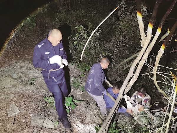 夜色渐深,救援人员心急如焚。大家打着手电筒沿着崎岖小径找寻,不停地呼喊着满某的名字,在搜寻了一个半小时后,民警隐约听见了呼救声,大家朝着发声处一步步靠近,最终在山林深处的竹林中找到了受伤的满某。