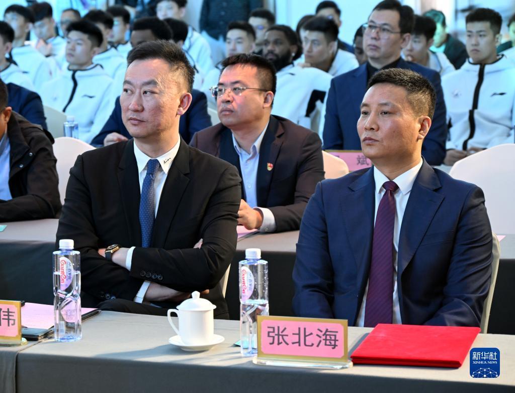 10月20日,青岛国信水产队主教练刘维伟(前左)、青岛国信海天雄鹰俱乐部总经理张北海在出征仪式上。新华社记者 李紫恒 摄