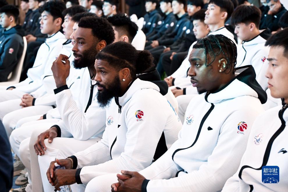 10月20日,新加入球队的外援球员弗兰克·巴特利(右二)、迈尔斯·鲍威尔(右三)、阿内特·摩尔特里在出征仪式上。新华社记者 李紫恒 摄