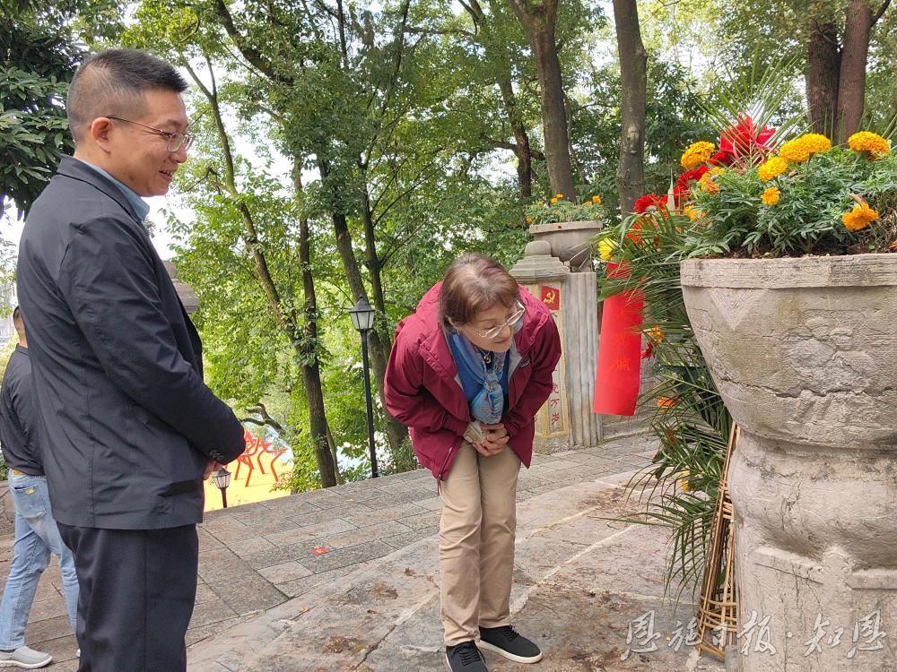 汤凌认真观察纪念碑前花坛上的图文。廖彬言 摄