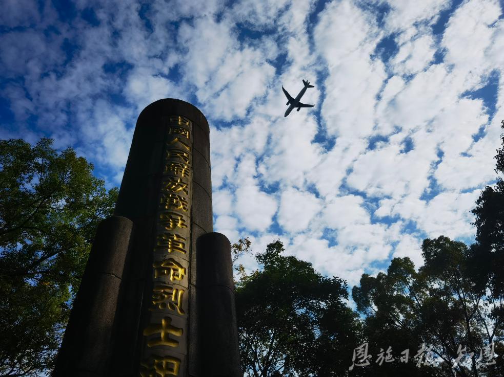 深秋的天空澄澈如洗,蓝天白云下、绿树环绕中,纪念碑高高耸立、直插云霄。