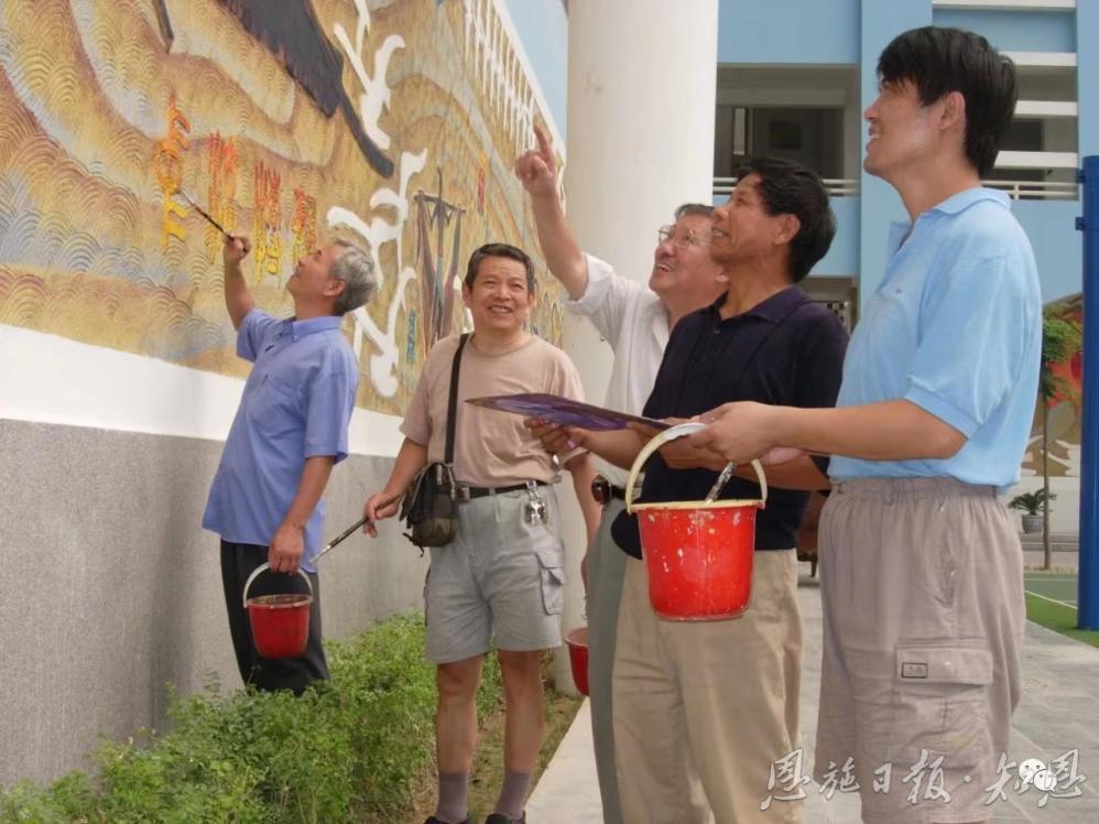 汤君超生前(右三)与创作团队在壁画《中流搏击》施工现场 。(资料图片)