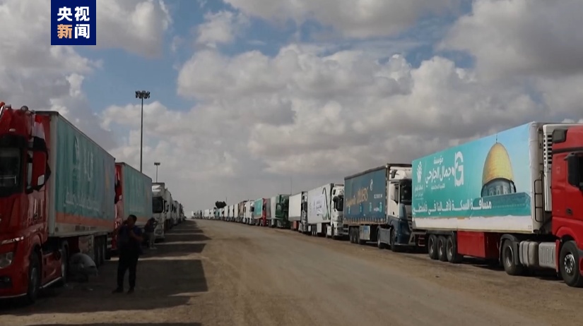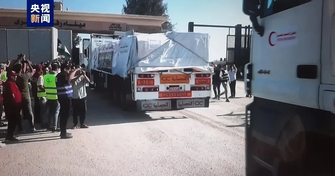 △现场画面:第一批人道主义援助车辆通过拉法口岸进入加沙地区