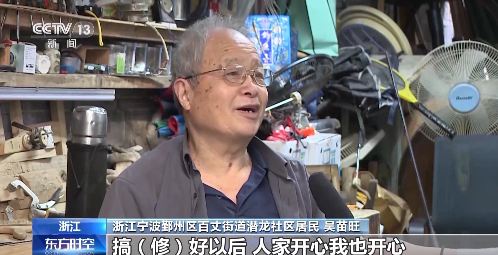 浙江宁波鄞州区百丈街道潜龙社区居民 吴苗旺:我年轻的时候单位里出差跑供销,全中国都去过了,现在工作坊这样子搞搞,蛮开心。年纪大的人都比较节约,他们拿来了,我想办法一定给他们修好,修好以后,人家开心我也开心。帮助别人快乐自己。
