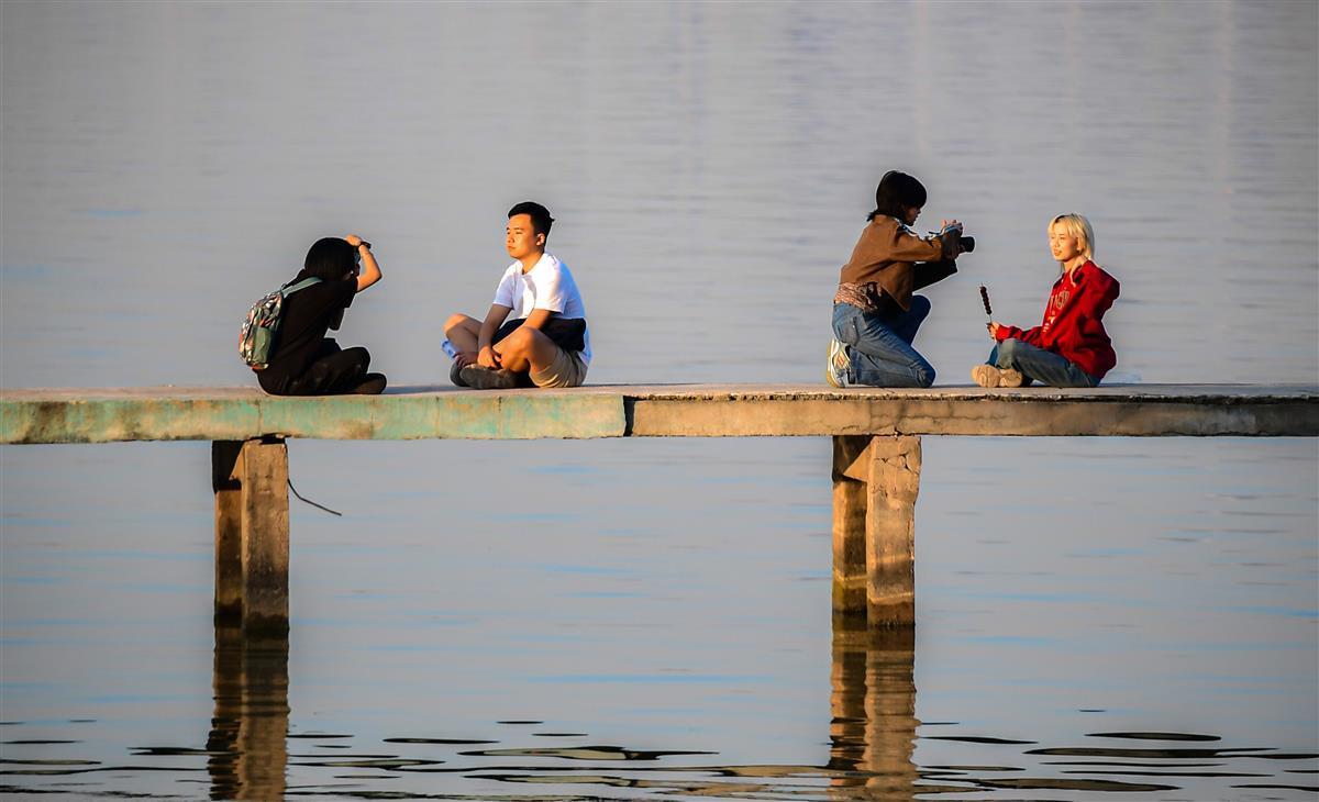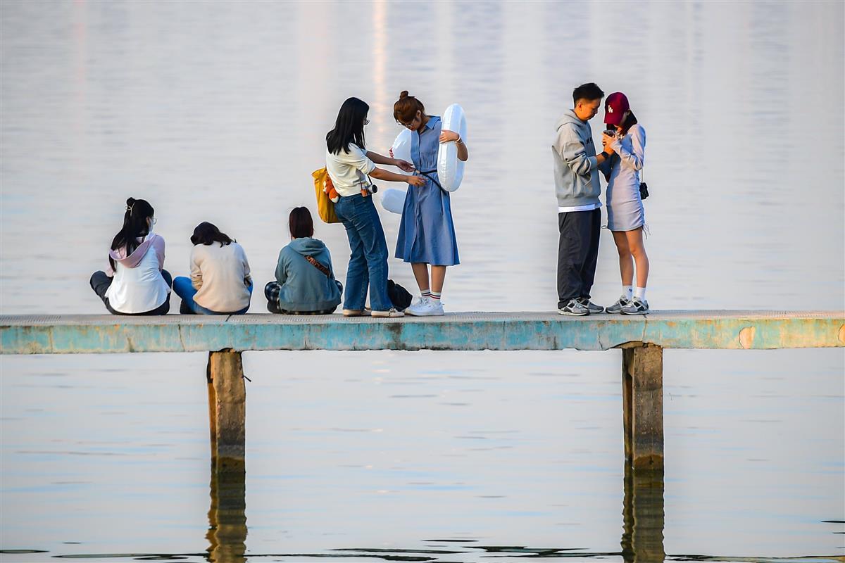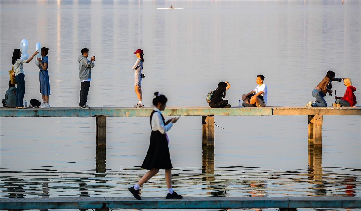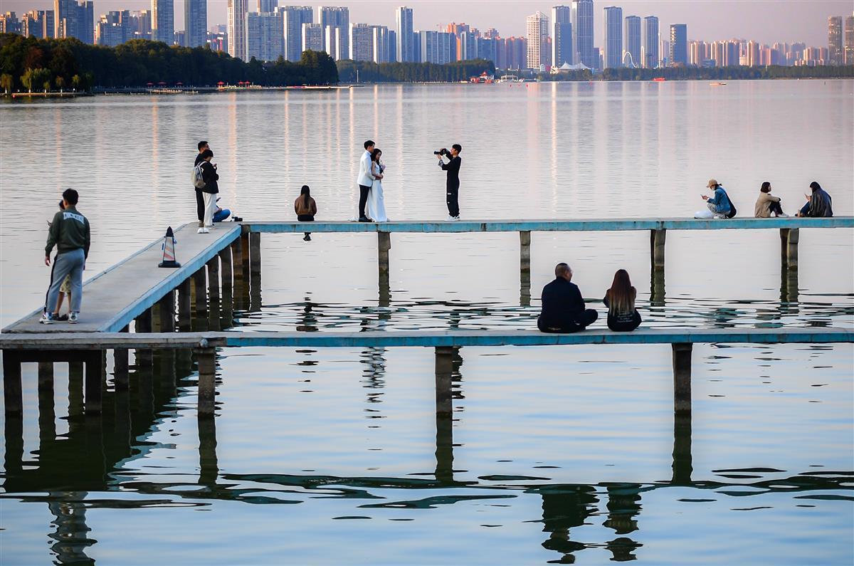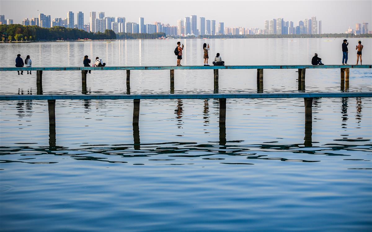 10月23日下午,武大凌波门,湖中纵横交错的栈道上,迎来了一批又一批看风景的游客,他们或坐或站或低声细语,或静静欣赏东湖的美丽景色,或用手中的相机或手机记录这难得的美景。他们也成为了这里的一道独特风景。