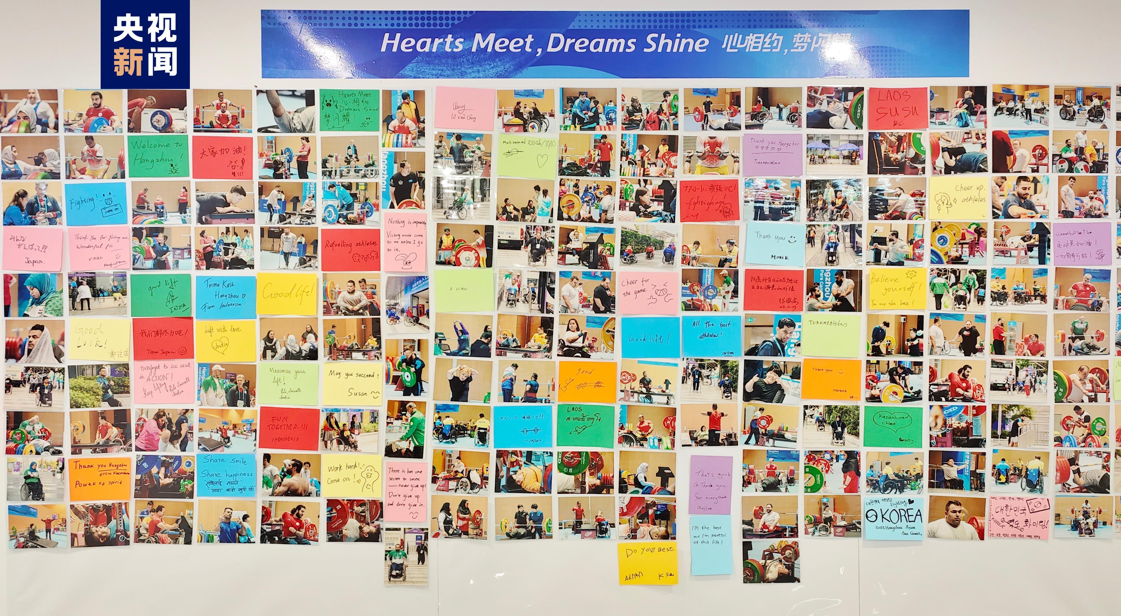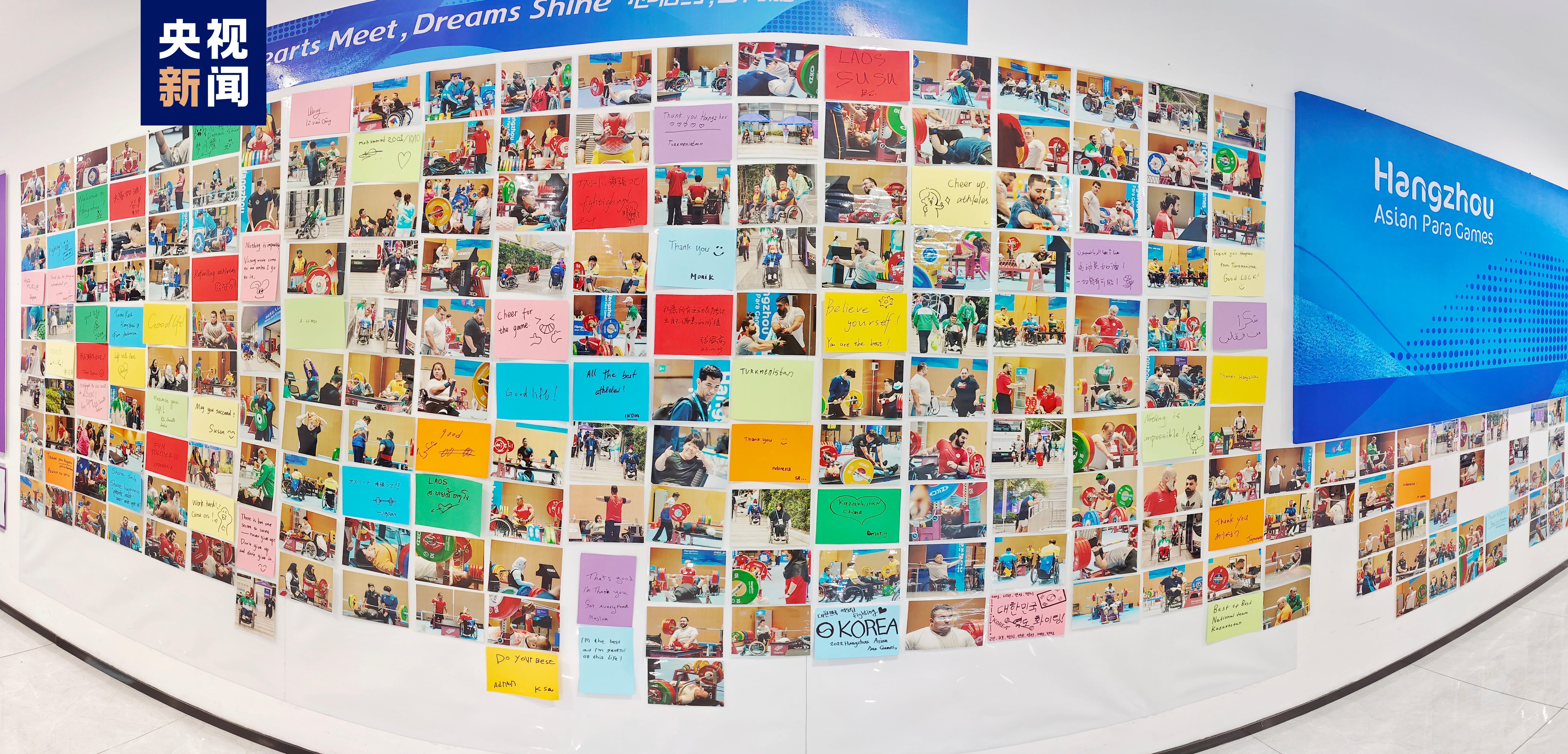 照片墙定格了100多位运动员在杭州亚残运会上训练时的场景,也鼓励他们在比赛中能取得好成绩。
