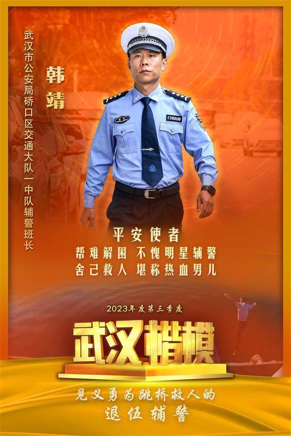 韩靖始终保持军人优良作风,充分发扬中队“全国学雷锋示范点”光荣传统,为维护辖区交通秩序、保障群众平安出行作出突出贡献。今年7月28日凌晨5时,月湖桥上一女子跳江。他不顾个人安危,毫不犹豫地从近30米高的月湖桥上纵身一跃,在水中游了近百米,拼尽全身力气救起轻生女子。