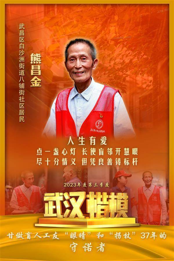 湖北日报讯(记者严芳婷、通讯员武宣)10月23日,武汉市委宣传部发布2023年第三季度“武汉楷模”榜单,甘做盲人工友“眼睛”和“拐杖”37年的守诺者熊昌金等10人(集体)上榜。