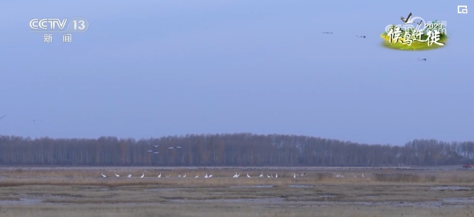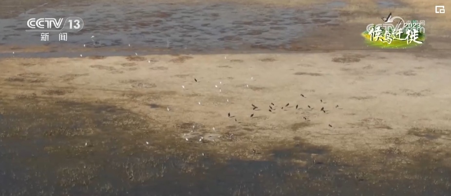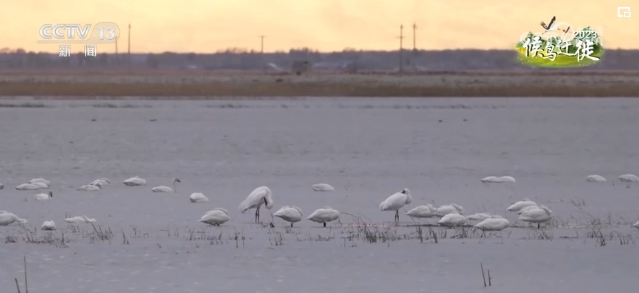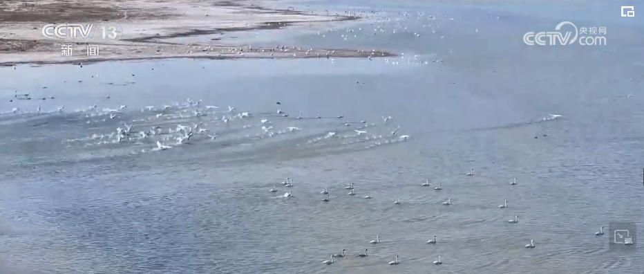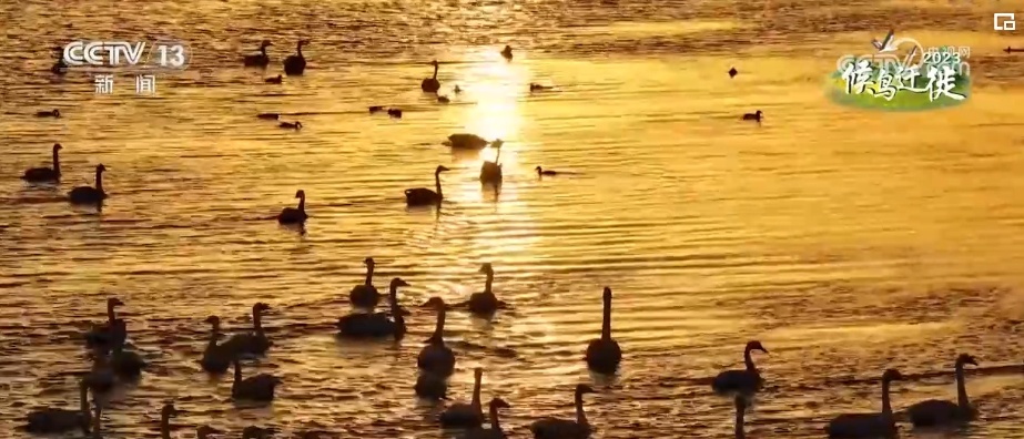 总台记者 阮超:今年在鄂尔多斯遗鸥国家级自然保护区过境候鸟数量达到了47000多只,种类达到了32种。这些过境候鸟当中有国家二级保护动物,比如大天鹅、小天鹅、疣鼻天鹅,还有白琵鹭,剩下的就是一些雁鸭类的候鸟。有的候鸟在天空振翅飞翔,有的在梳理羽毛,还有的低头在水中或者在岸边觅食。尤其是傍晚的时候,夕阳西下,金黄色的阳光洒在湖面上,空中偶尔有候鸟飞过,使人不得不想起那句“落霞与孤鹜齐飞,秋水共长天一色”。