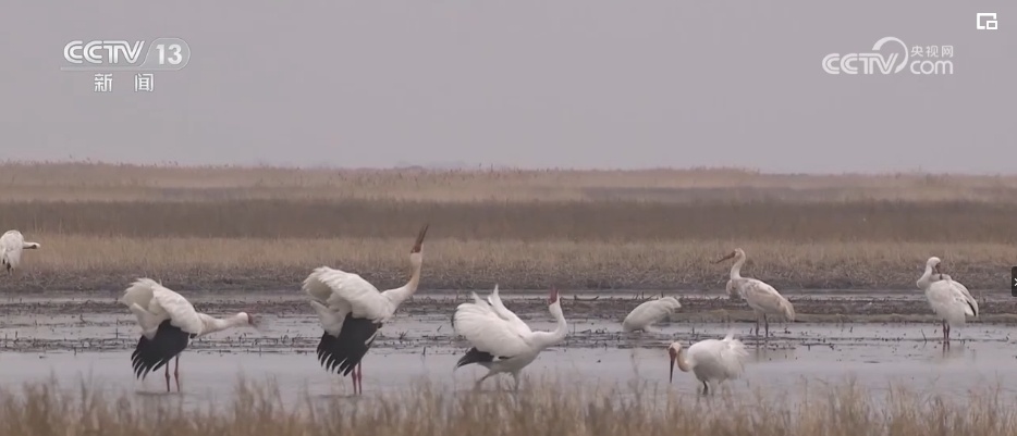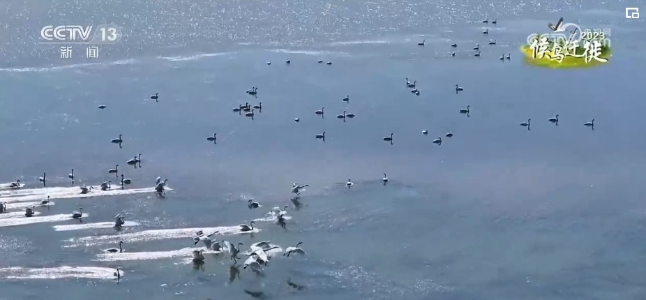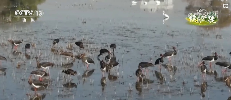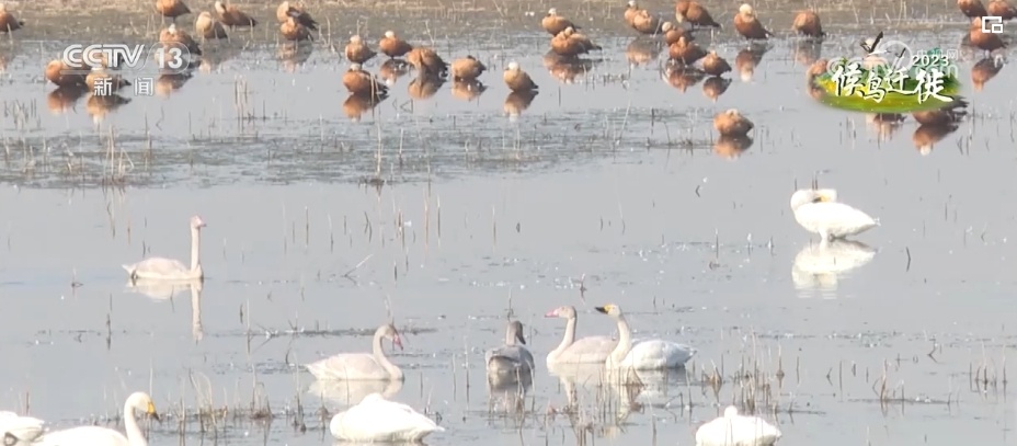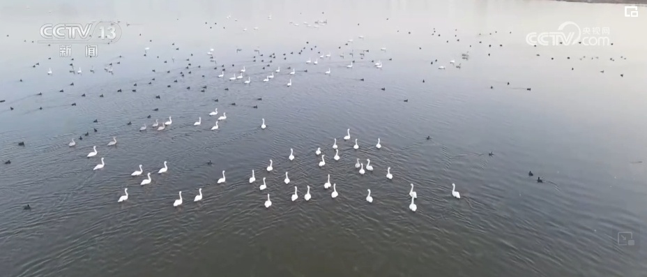 总台记者 韩逾昊:在山西省山阴县的桑干河国家湿地公园,可以看到成群结对的天鹅正在觅食。根据工作人员的观测和统计,这几天天鹅的数量已经达到了500多只,还有300多只白鹭,数量基本上和去年持平。特别是国家一级保护动物黑鹳的数量已经达到了50多只,是近几年最多的一年。
