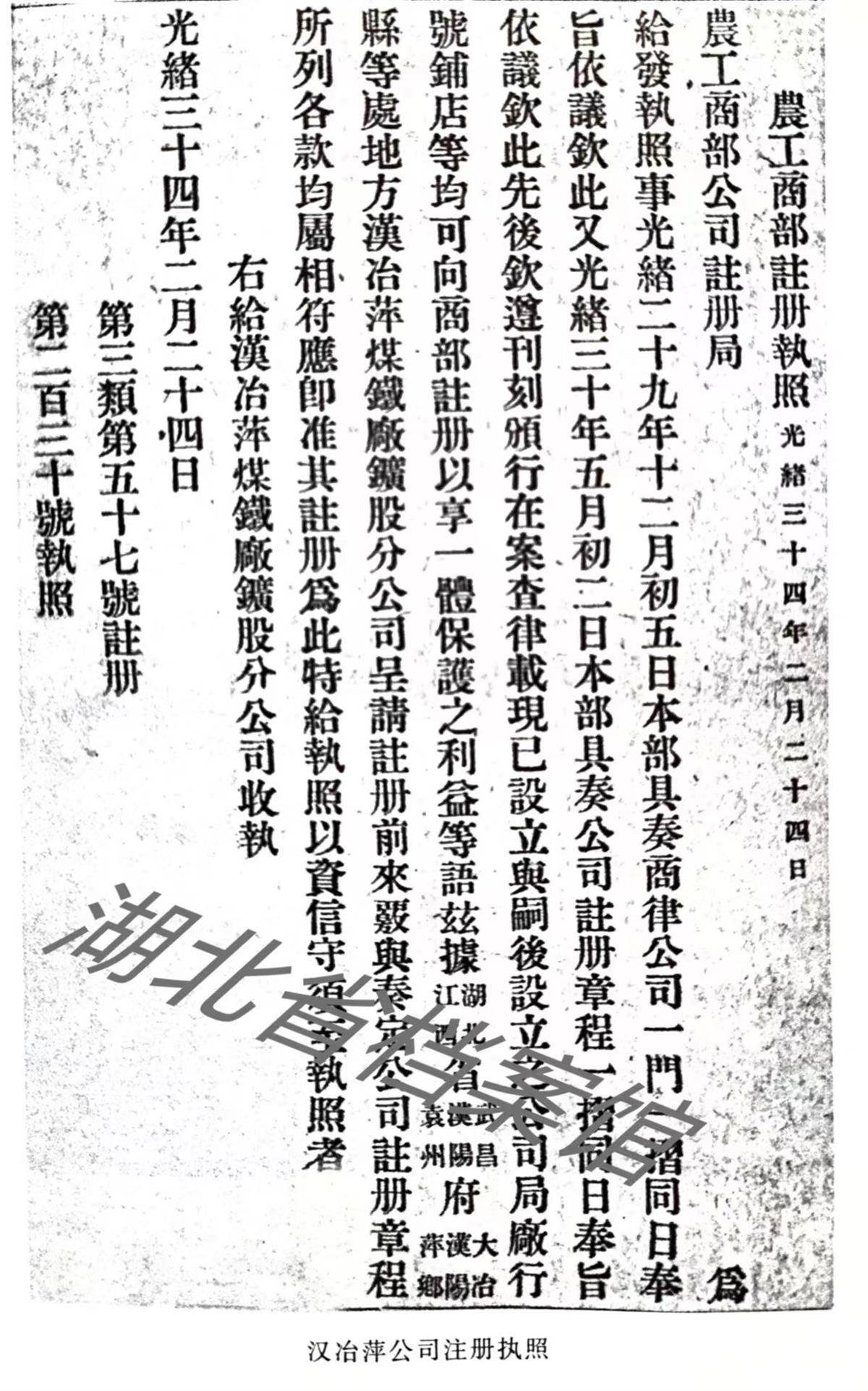 湖北省档案馆至今珍藏着光绪三十四年,即1908年清政府颁发的汉冶萍煤铁厂矿有限公司注册执照,标志着“汉冶萍”正式登上历史舞台。在这份执照上,可看到汉阳、大冶、萍乡三个地名,这正是“汉冶萍”三个字所代表的地方厂矿,它们互相依托,形成了当时亚洲最大和中国最早的钢铁联合企业。“汉冶萍”的诞生和洋务运动的代表人物张之洞关系密切。