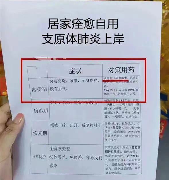 10月24日下午,武汉的赵女士(化姓)注意到4岁的女儿有些咳嗽。一直到晚上,孩子依旧咳嗽不停,甚至影响到了睡眠。她想到朋友圈最近热传的“支原体肺炎上岸”教程,里面写到咳嗽是“潜伏期”的典型症状,立马怀疑孩子是“中招”了。按照“教程”和另一份支原体肺炎网红“三件套”,赵女士火速购买了阿奇霉素、布洛芬、愈酚甲麻那敏。