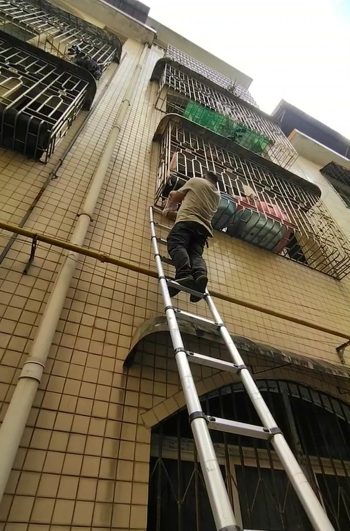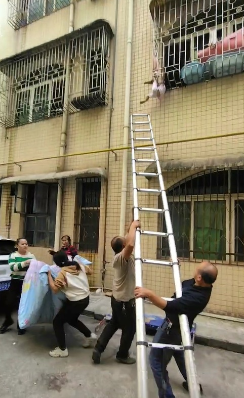 在湖南郴州临武县,一名3岁左右的女童脖子被二楼的防盗窗卡住,身体悬空,都快哭不出声了。危急关头,多位居民在楼下撑开棉被,在附近施工的一名工人将梯子搭在墙上,一人顺着梯子往上爬,将小女孩托举回屋内。10月26日,拍下全过程的邝先生向极目新闻(报料邮箱:jimu1701@163.com)记者称,希望家长千万不要将孩子一个人留在家里。