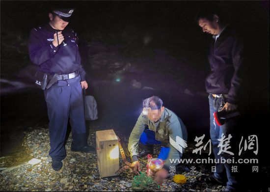 10月30日凌晨1时许,保康县公安局黄堡派出所接到群众举报,称蛮河流域黄堡镇岞峪村2组河道内有人用电鱼机打鱼。接警后,民警与村干部立即赶赴现场,发现嫌疑人已扔弃鱼类水产品,并关闭夜钓灯帽,试图趁夜色躲避民警追踪,不料还是被民警搜索发现,并依法传唤嫌疑男子辛某到派出所接受调查。