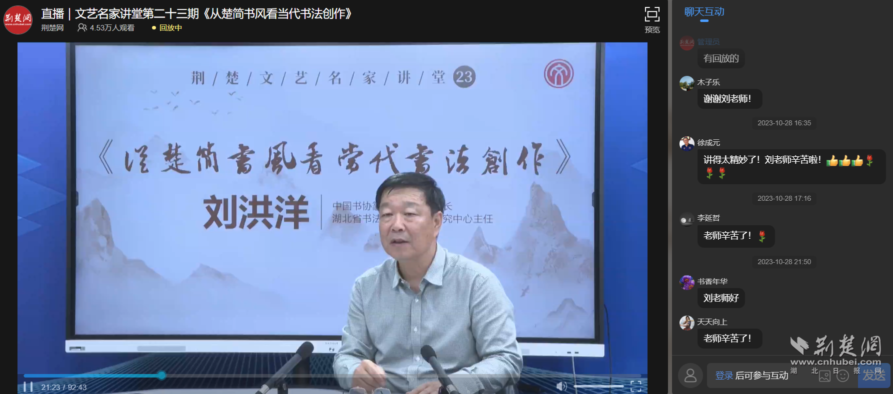 10月28日,中国书协篆刻委员会秘书长、湖北省书法院楚简书法研究中心主任刘洪洋做客“荆楚文艺名家讲堂”,进一步解读何谓“一字千金”,并与4万余网友分享书法界从楚简书风中得到的启示。