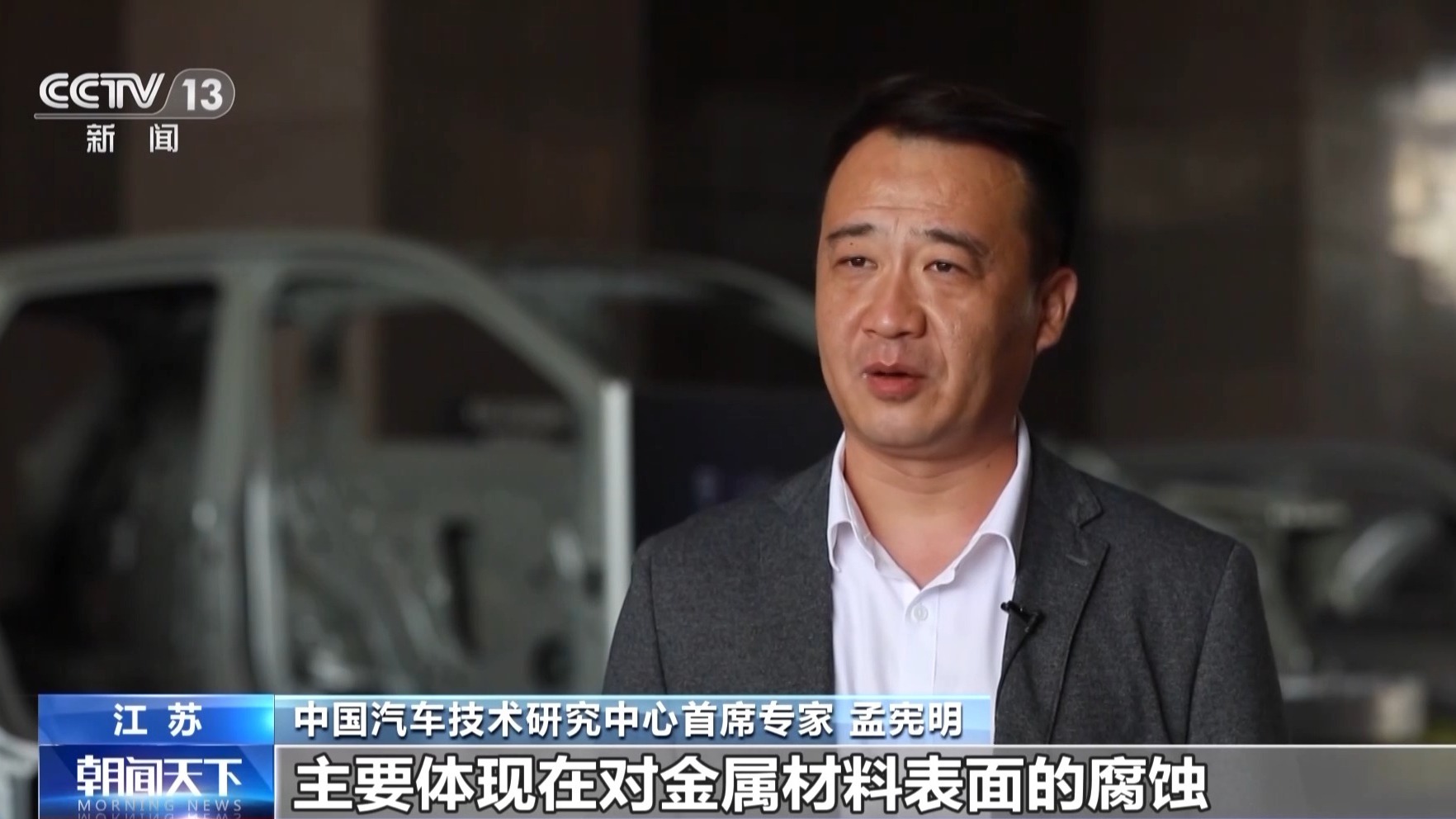 中国汽车技术研究中心首席专家 孟宪明:盐水侵蚀,就是自然环境中比较常见的影响因素。盐水腐蚀对汽车的危害主要体现在对金属材料表面的腐蚀,因此,耐腐蚀性是汽车设计、开发和验证中的重要一环。