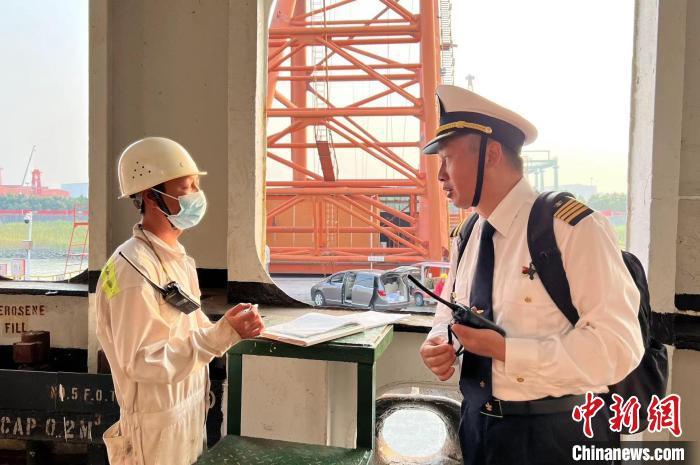 长江引航中心高级引航员蔡文鹏与一名船员进行交流。朱晓颖 摄