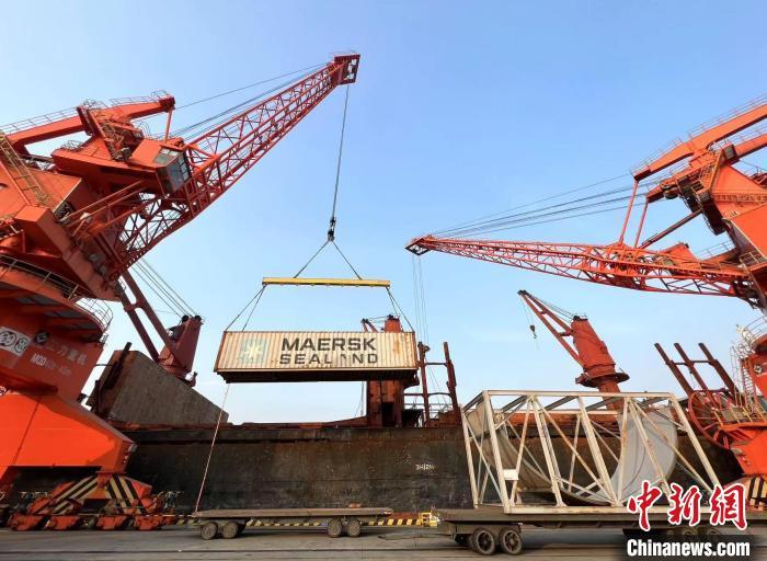 张家港港新重装码头港务有限公司总经理龚伟忠告诉中新网记者,中国重型机械行业江海联动基地在此成立,长江沿线“江海联运枢纽”雏形逐渐形成,从这里出江远航、发往“一带一路”共建国家的生产建设物资的数量位居全国前列。