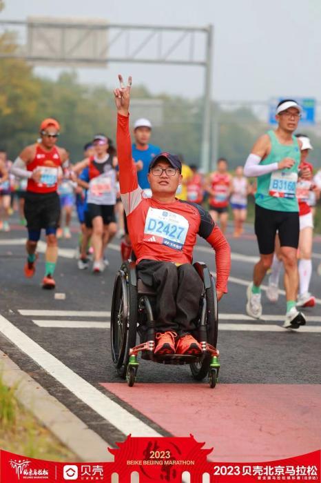 “我在今年北马跑到了3小时42分,对自己的表现还不是很满意,其实目标是达到 ‘330’(3小时30分)。但是因为途中手上磨出两个非常大的水泡,每推一下轮椅就特别痛,因此去医疗补给站包扎,耽误了时间。”